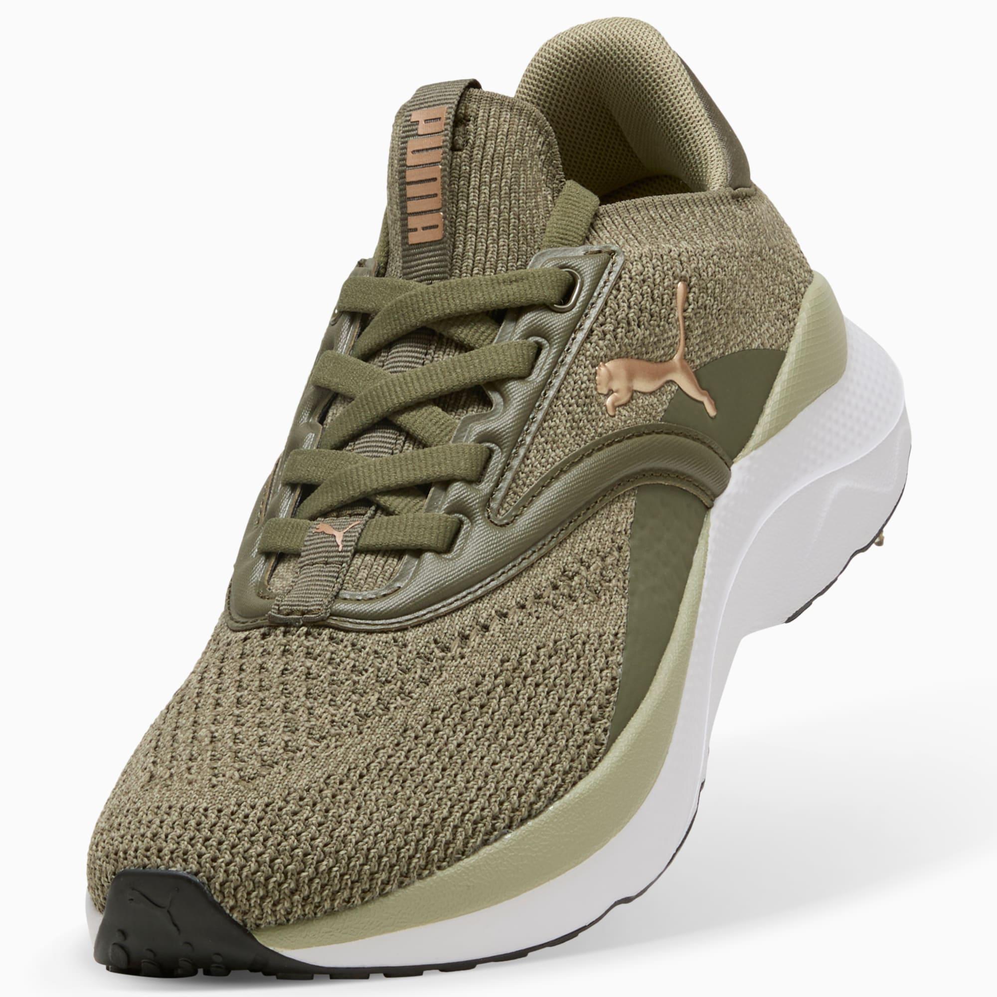 descriptionSOFTRIDE Mayve utilizes our plush and comfortable SOFTRIDE foam and SOFTFOAM+ footbed, ensuring all-around comfort. This style features a clamshell construction, premium knitted upper material, mixed with premium finishes throughout the upper. With a unique eyestay and deco-stitching, enjoy fashion without sacrificing comfort. It's all in the new SOFTRIDE Mayve running shoe.Style: 310160_24Color: Loden Green-Lux Army-PUMA Goldfeatures & benefitsThe upper of the shoes is made with at least 20% recycled materialsSOFTFOAM+: Step-in comfort sockliner designed to provide soft cushioning thanks to its extra thick heelSOFTRIDE: Soft foam designed for all-day cushioning and comfortdetailsLace closureZoned rubber tractionHeel-to-toe drop: 9mmSurface type: Road runningRecommended for: neutral pronatorsmaterials & careMaterial informationMidsole: 100% SyntheticSockliner: 100% TextileOutsole: 59.10% Synthetic, 40.90% RubberUpper: 74.45% Textile, 25.55% SyntheticLining: 100% Textile