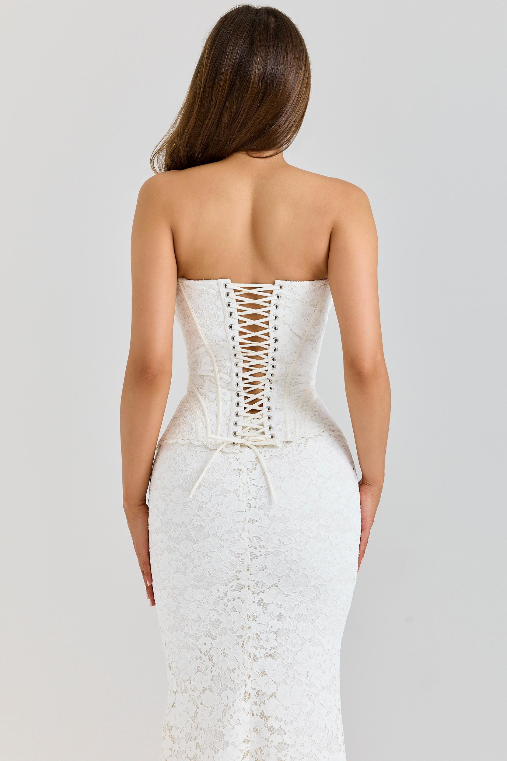 Set to stun at any special occasion, the captivating beauty of 'Solaine' catches every eye. This all-in-one floral lace number gives the illusion of a corset and skirt pairing. You'll find the delicate lace fabric is meticulously crafted to a classic corset top with intricate boning and an underwired bust that provides enough support to leave your shoulders on display. At the back, you can increase the cinch with our signature lace up back and there's a side zip for added comfort.