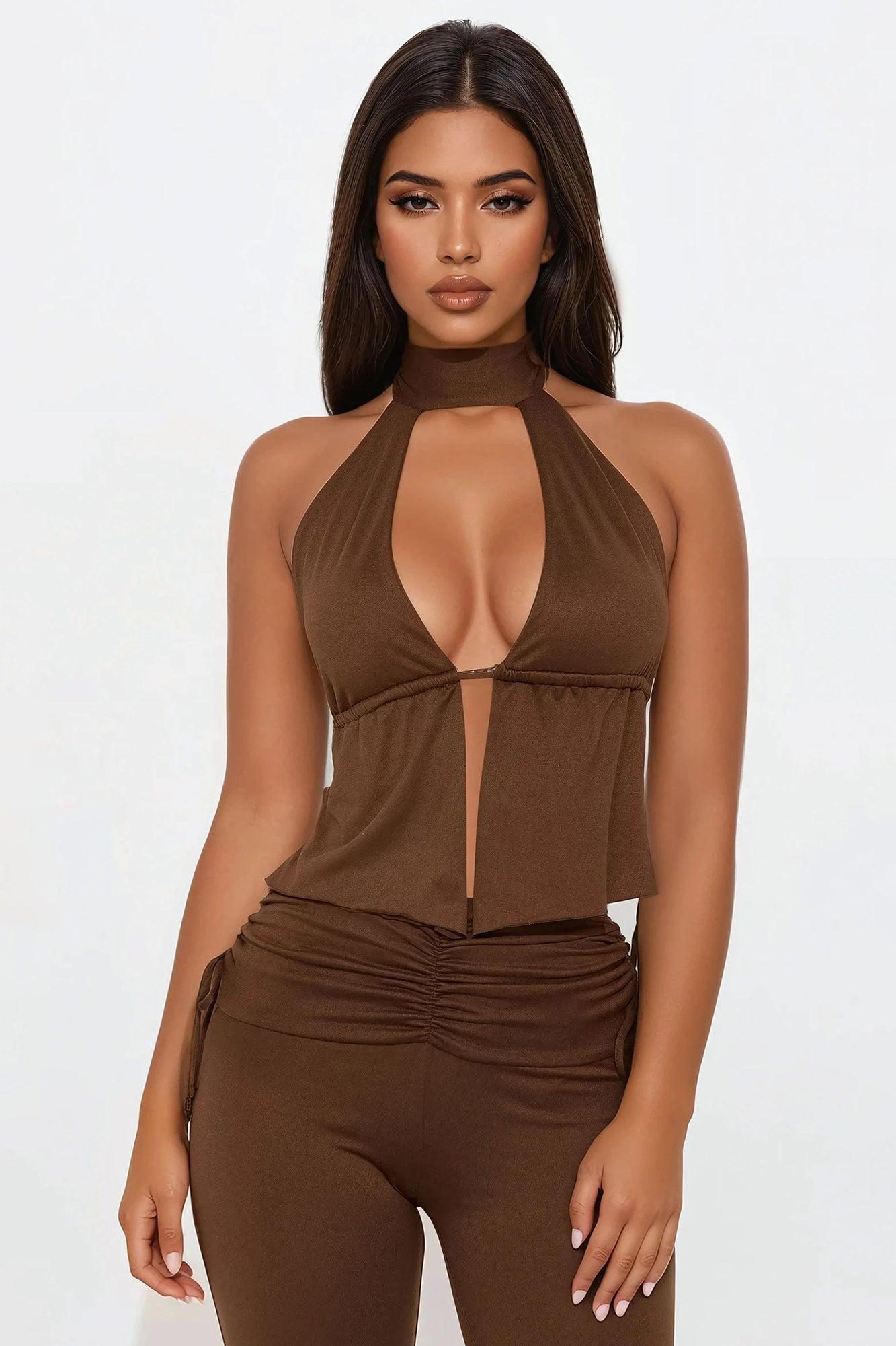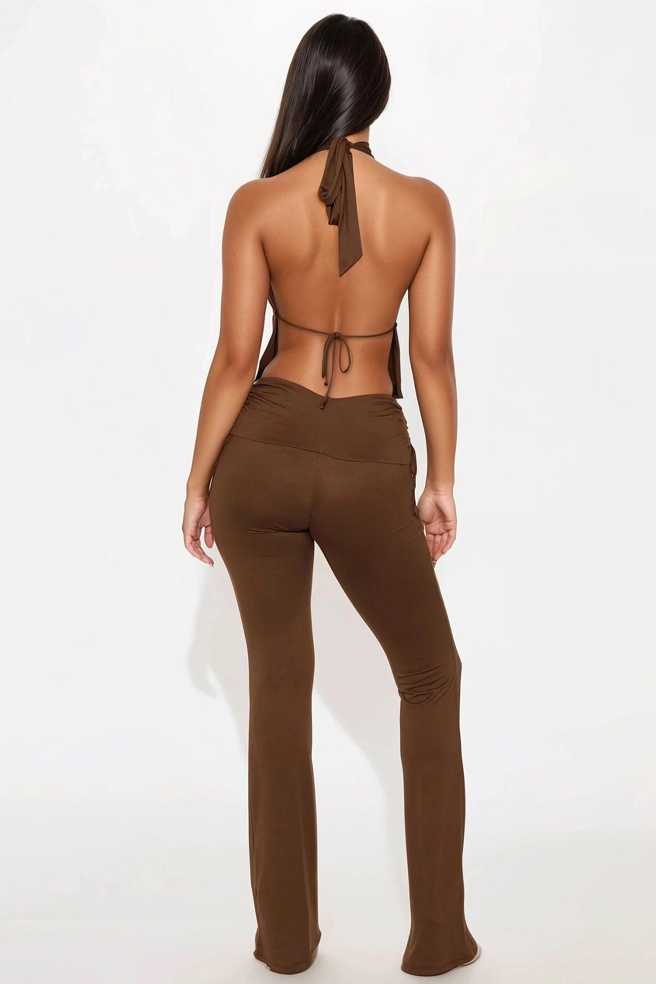 Available In Brown. Halter Top and Pant Set Stretch Tall 34.5" Inseam Elastic Waistband 95% Polyester 5% Spandex Imported
