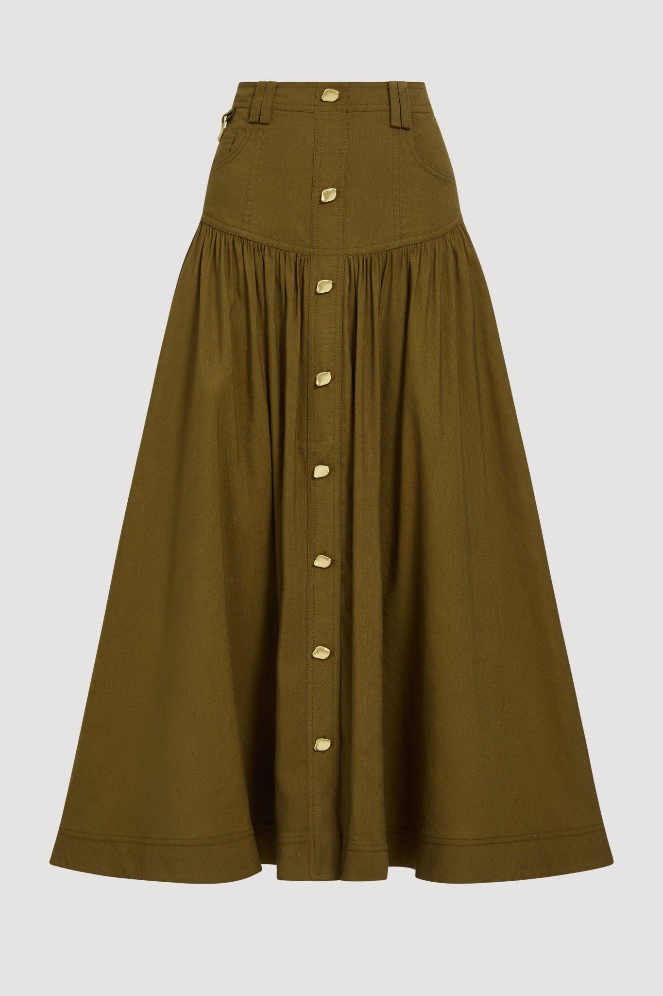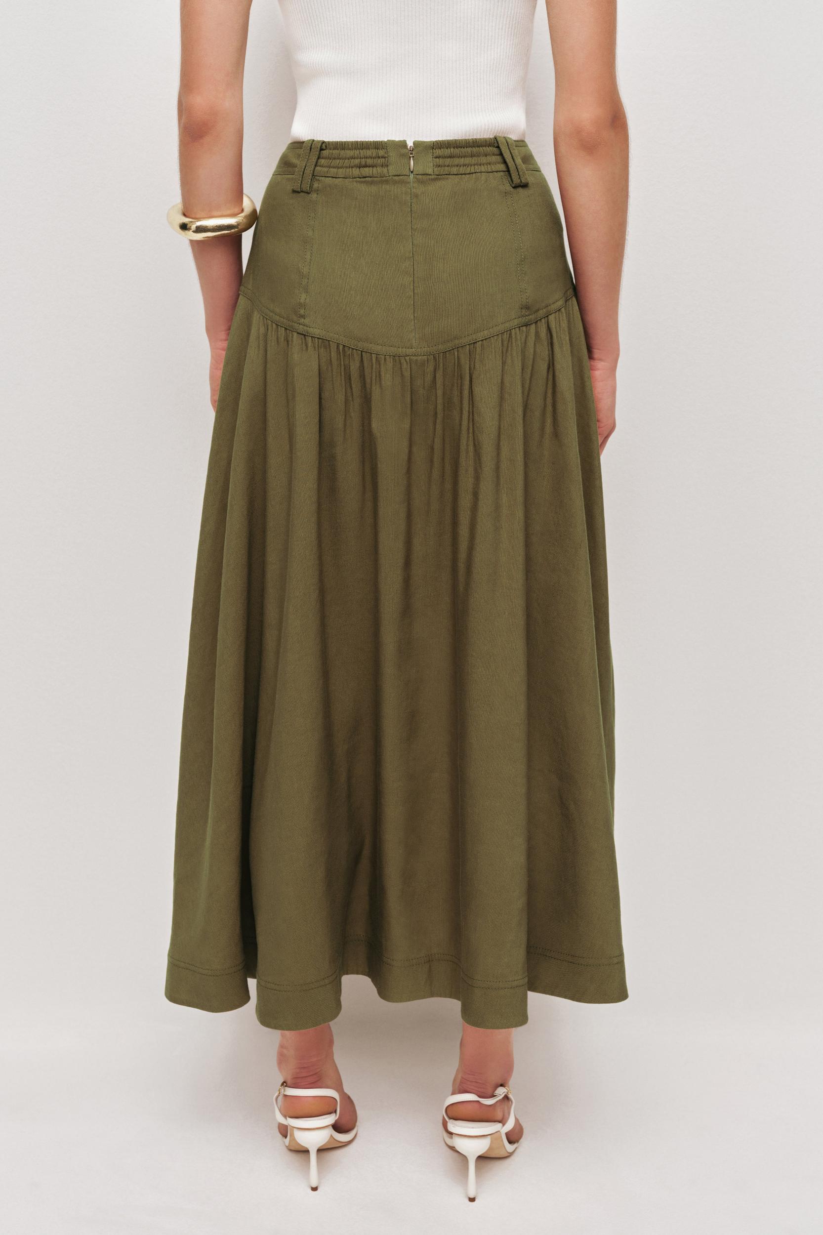 PRODUCT DETAILS Women's midi skirt Non-functional button placket Twin belt loops D-ring waistband detail Side and coin pockets Topstitching detail Zip, hook and eye closure 55% Linen, 45% Rayon Shop All Skirts SIZE AND FIT Model wears a size 8/S