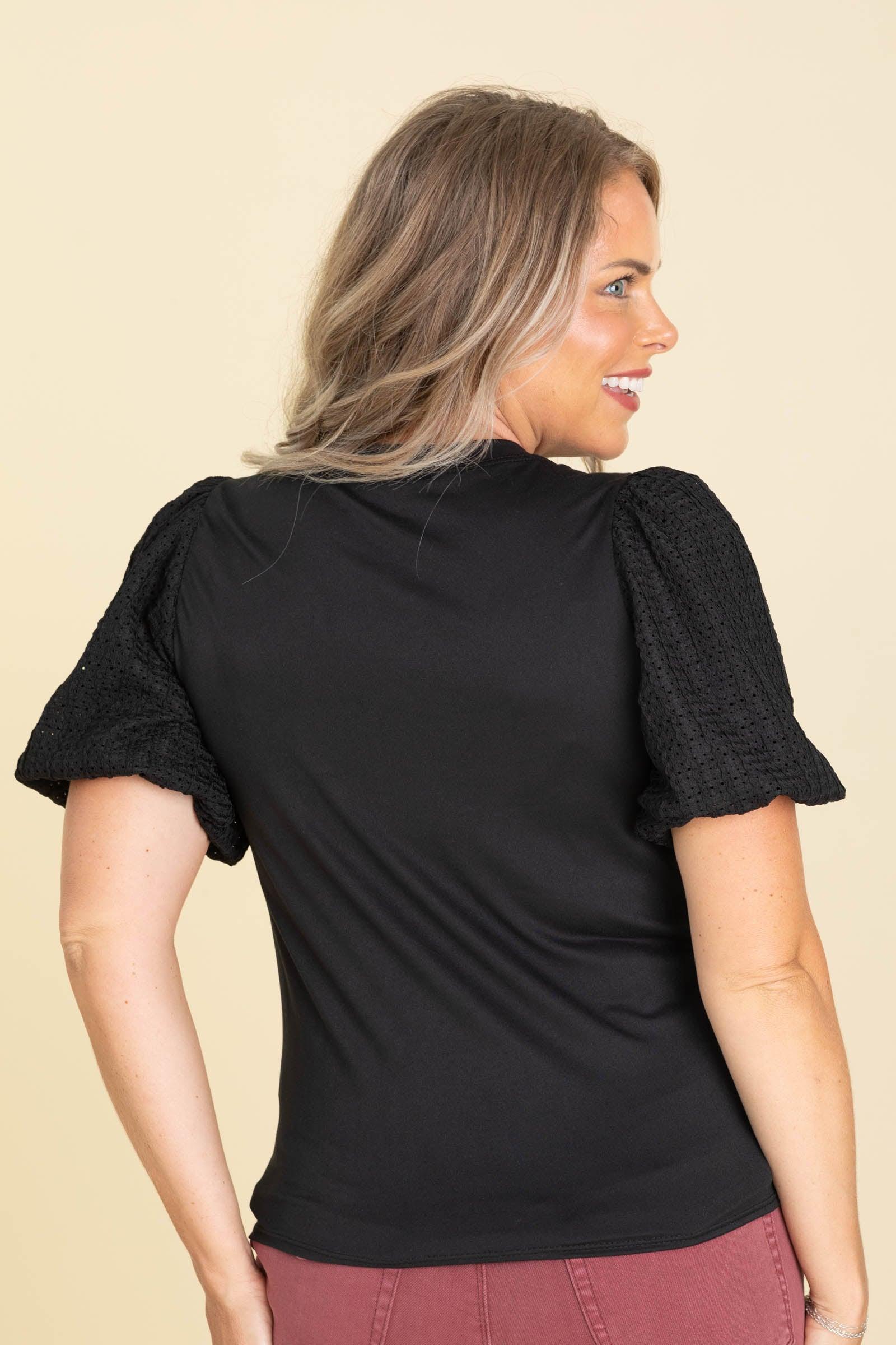 Product Details Colors: Black/ White Print: Solid with Contrast Sleeves Neckline: Round Sleeve: Short Sleeve Hemline: Straight Brand: Les Amis Material and Care Self: 96% Polyester, 4% Spandex Contrast: 100% Polyester Machine Wash Cold Tumble Dry Low Made in the USA Size and Fit Small: Bust 34" Waist 33" Length 24.5" Medium: Bust 36" Waist 35" Length 25" Large: Bust 38" Waist 37" Length 25.5" Erica is 5’7” and wearing her true size small