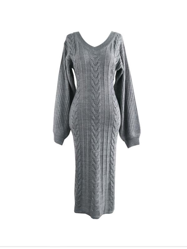 Solid V Neck Cable Knit Split Knit Midi Dress