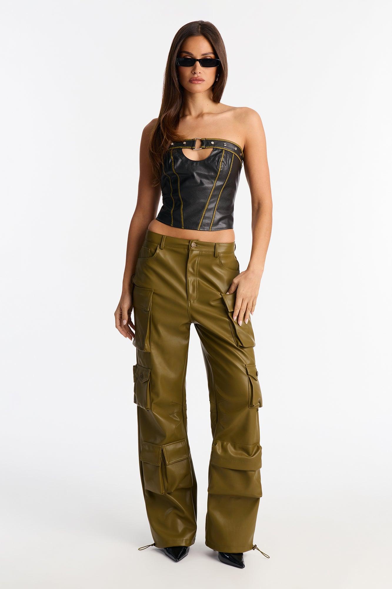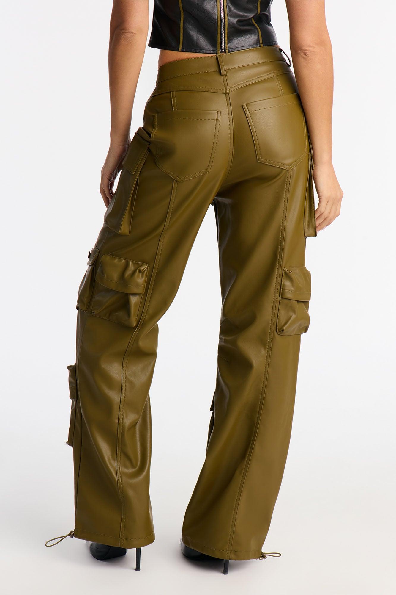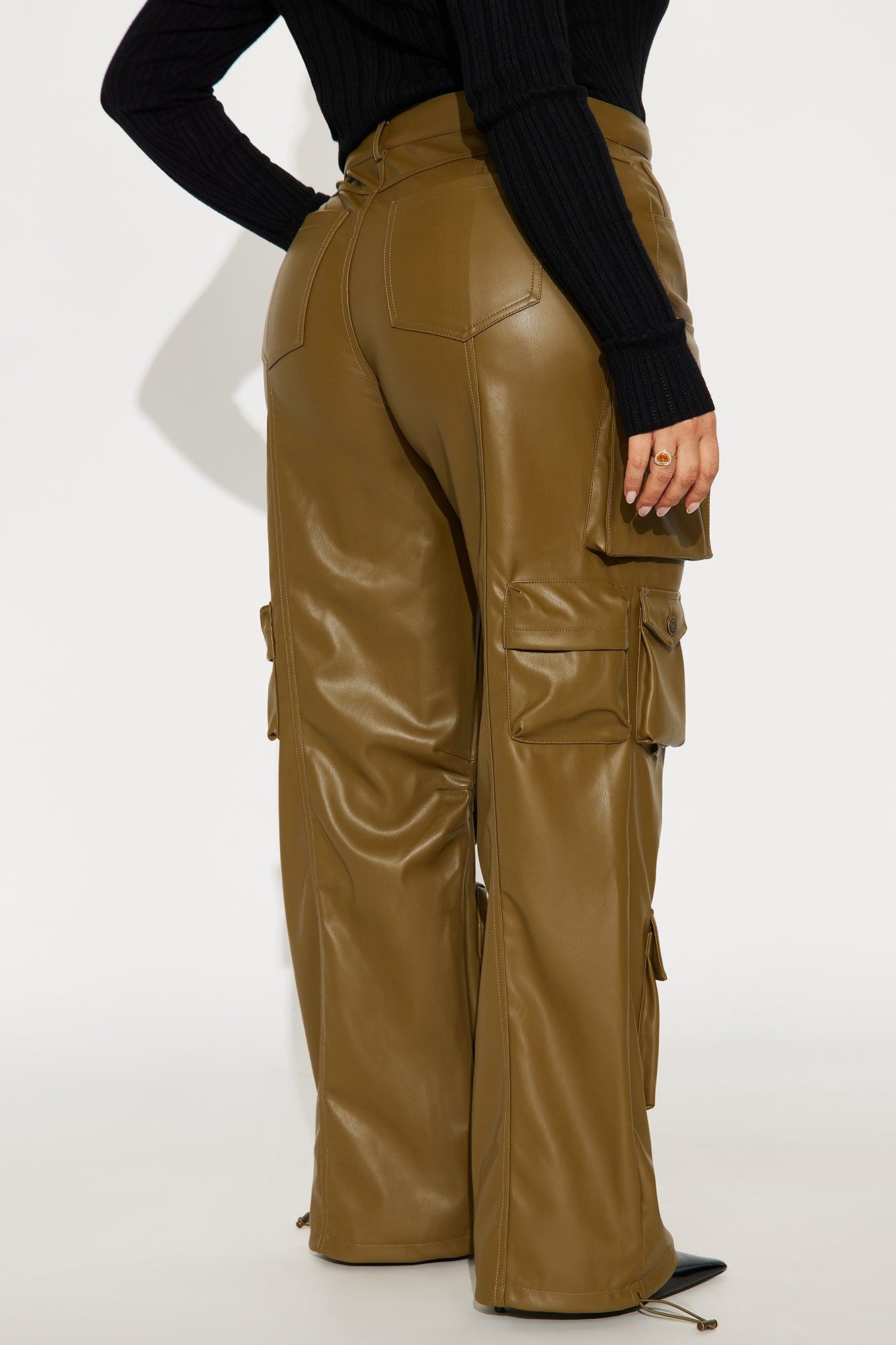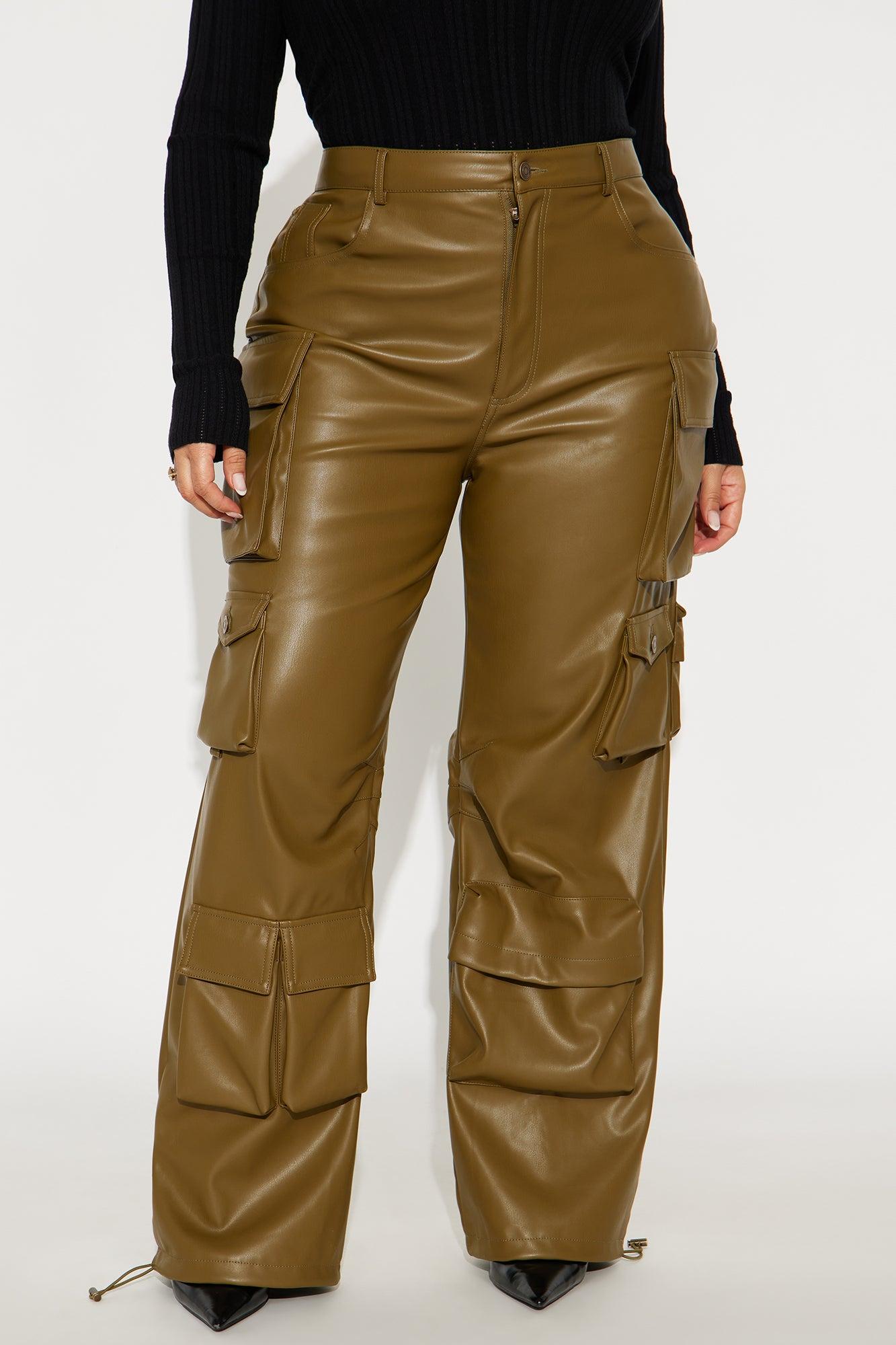 Available In Black, Burgundy And Military Green. Wide Leg Button Zipper Closure Mid Rise Faux Leather 32" Inseam Cargo Pockets Adjustable Ankle Tie Stretch 14 Pockets Shell Coating : 100% Polyurethane Backing : 100% Polyester Lining : 100% Polyester Imported California Proposition 65WARNING: Cancer and Reproductive Harm - www.P65Warnings.ca.gov.