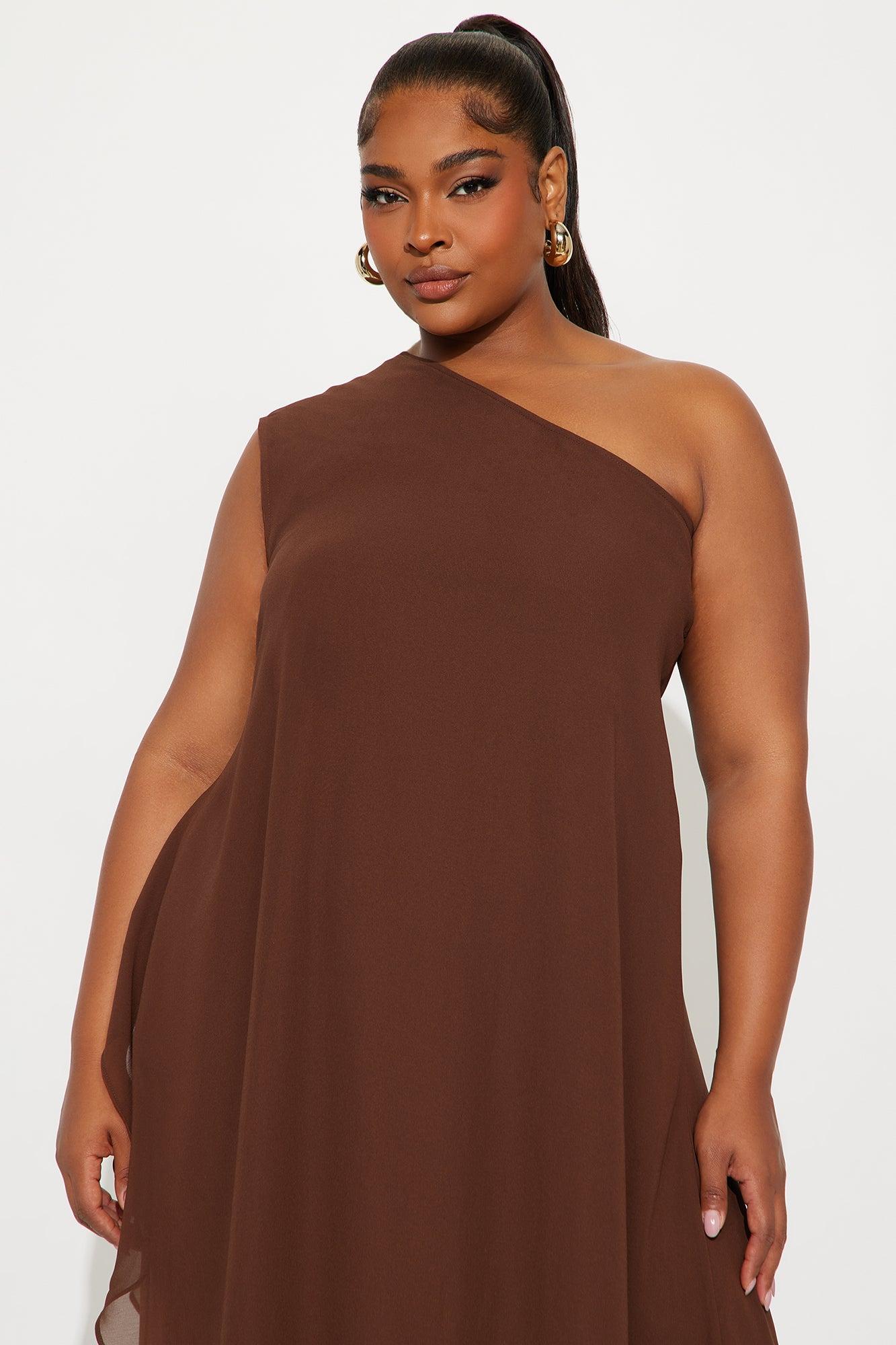 Available In Chocolate. 2 Piece Ensemble One Shoulder Top And Wide Leg Pant Set Non Stretch Inseam 33" Draped Fully Lined Elastic Drawstring Waistband On Pant Shell: 100% Polyester Lining: 100% Polyester Imported
