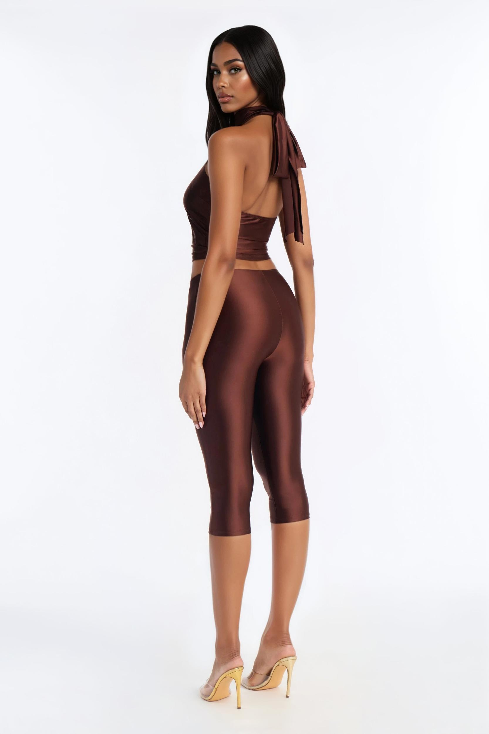Available In Chocolate. 2 Piece Ensemble Tie Halter Top And Capri Legging Set Stretch Inseam 18" Elastic Waistband Self: 76% Nylon 24% Spandex Imported