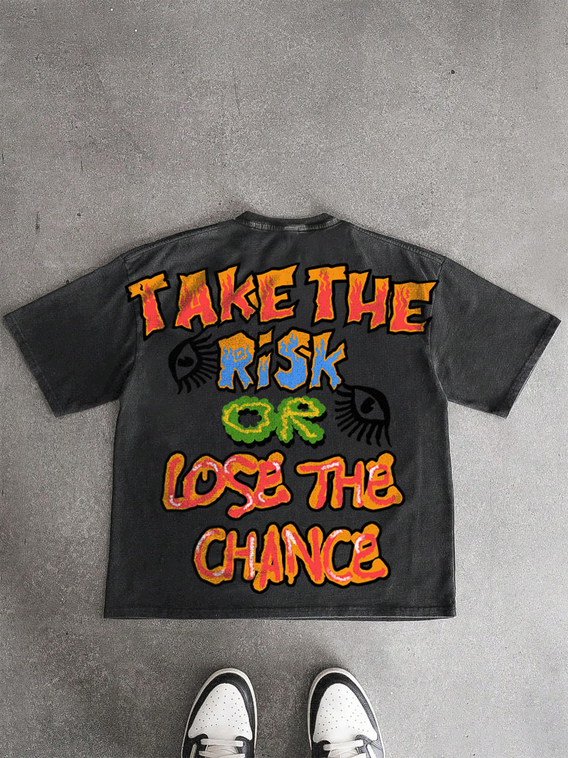 Take The Risk Or Lose The Chance Graphic Print Acid Washed T-Shirt. SPU: CP-154076-ZYL Fabric Name: 100% Cotton Wax-Dyed Fabric Pattern: "Take The Risk" Or "Lose The Chance" Graphic Process: Printed Style: Retro Length: Regular Collar: Round Neck Popular Elements: Acid Washed Sleeve Type: Short Sleeve Occasion: Daily, Street Theme: Summer