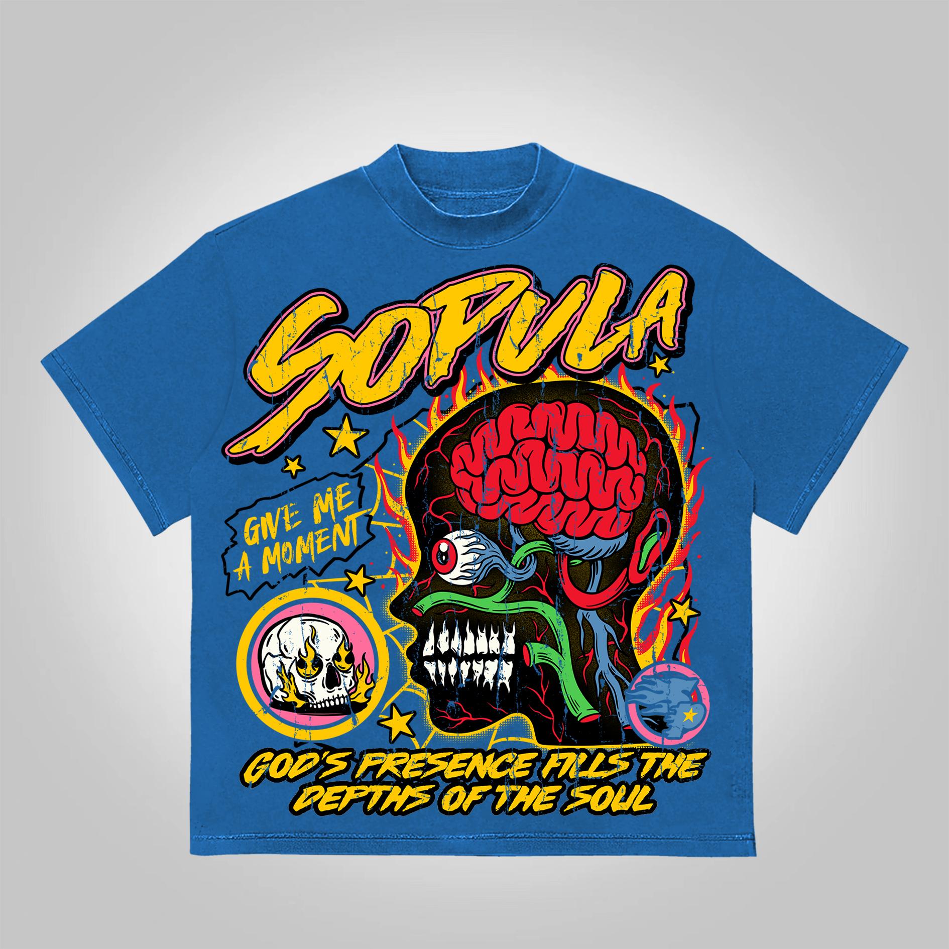 SPU: CP-134596-ZYL Fabric Name: 100% Cotton Pattern: Sopula Burning Soul Graphics Process: Printed Style: Vintage Length: Regular Collar: Round Neck Popular Elements: Skull Print Sleeve Type: Short Sleeve Occasion: Street Theme: Summer