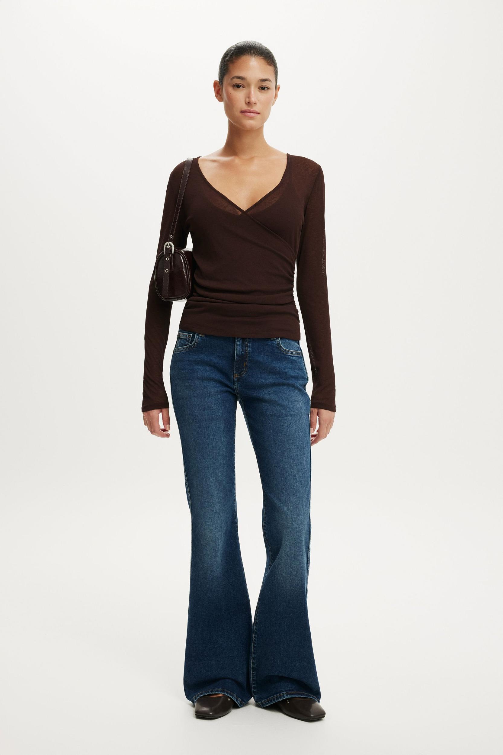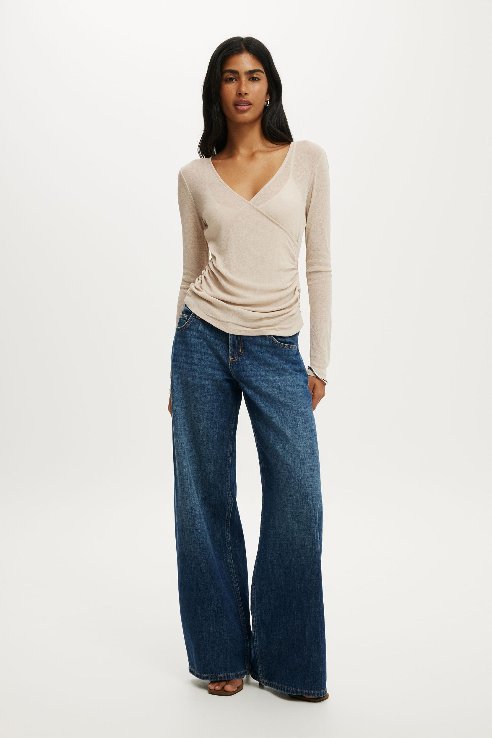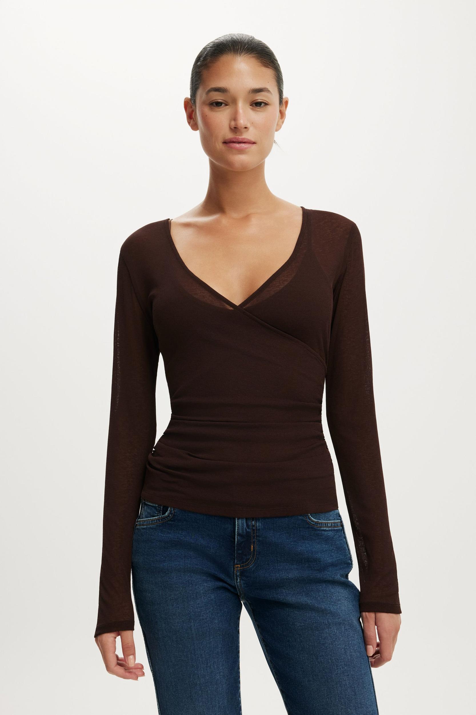 Long Sleeve ,Faux Wrap Front ,Rouching Detail on Sides ,Fabrication Designed to be Sheer ,Using Recycled Fibers