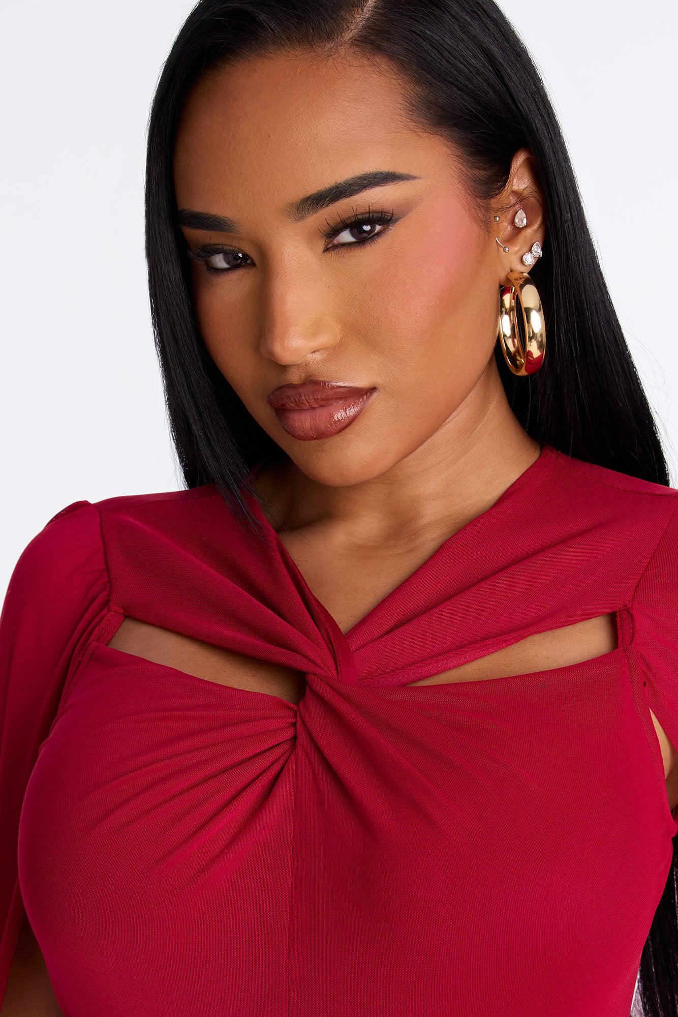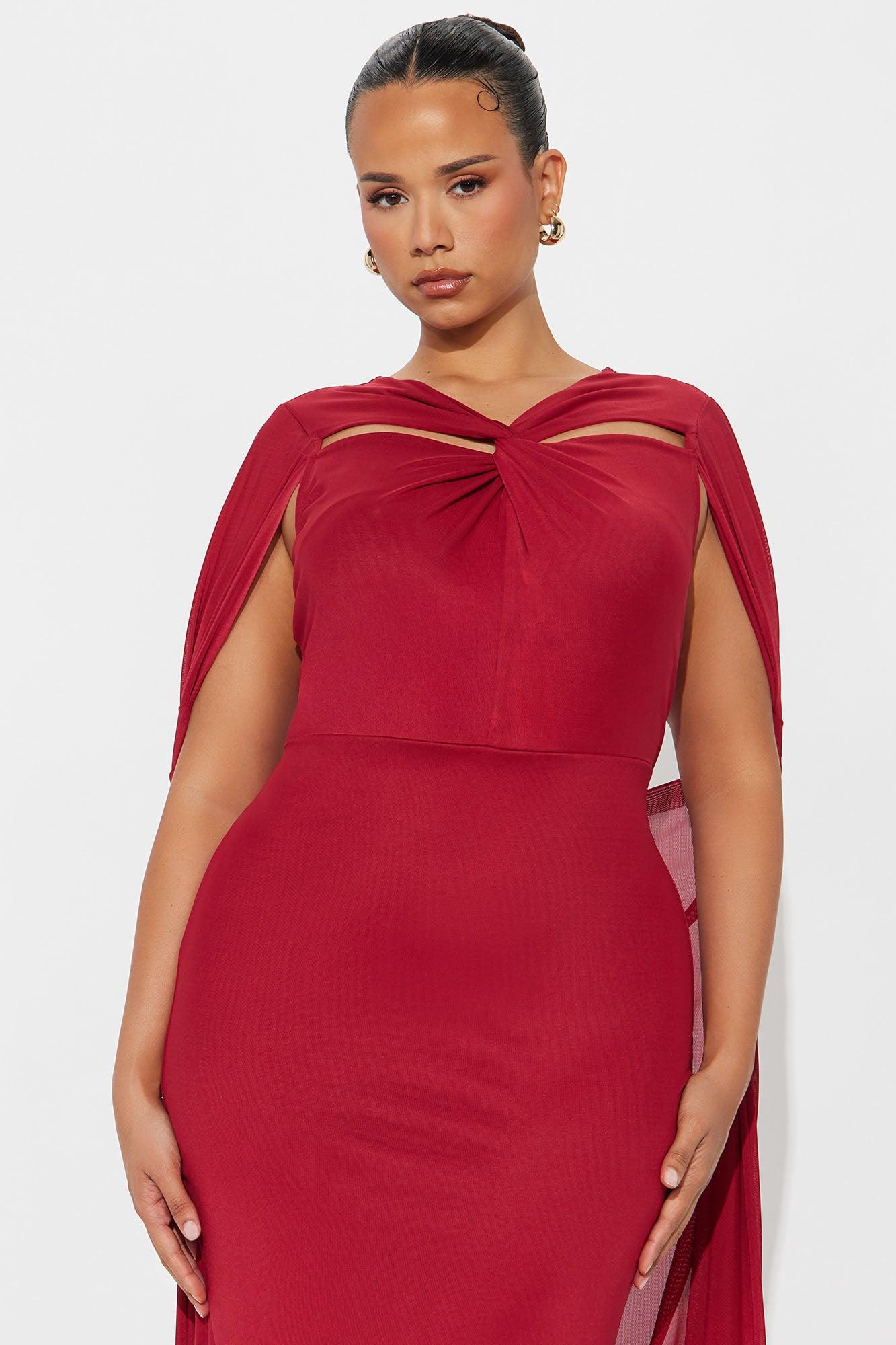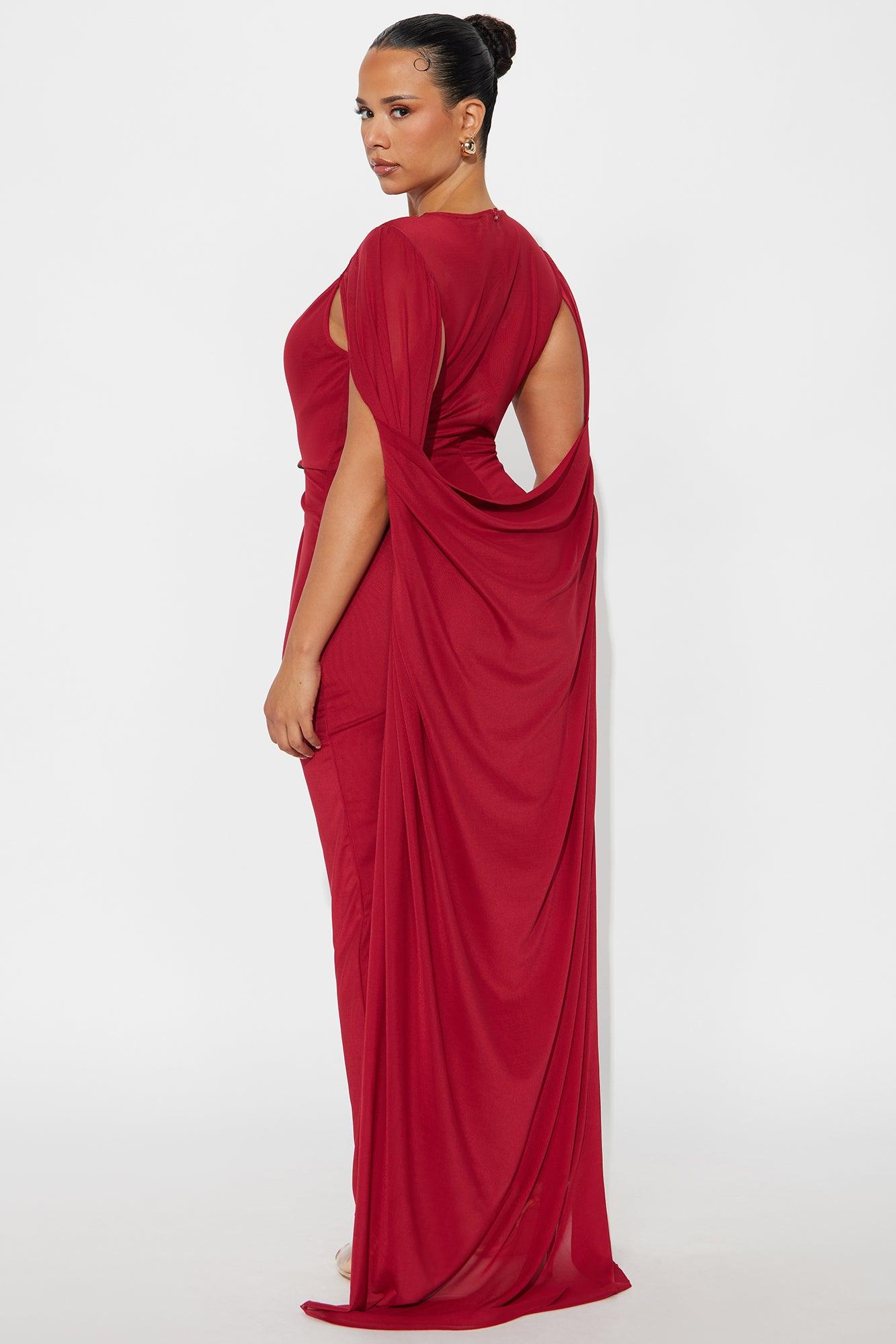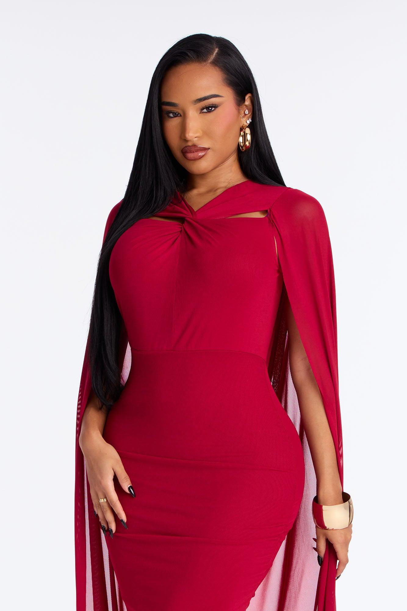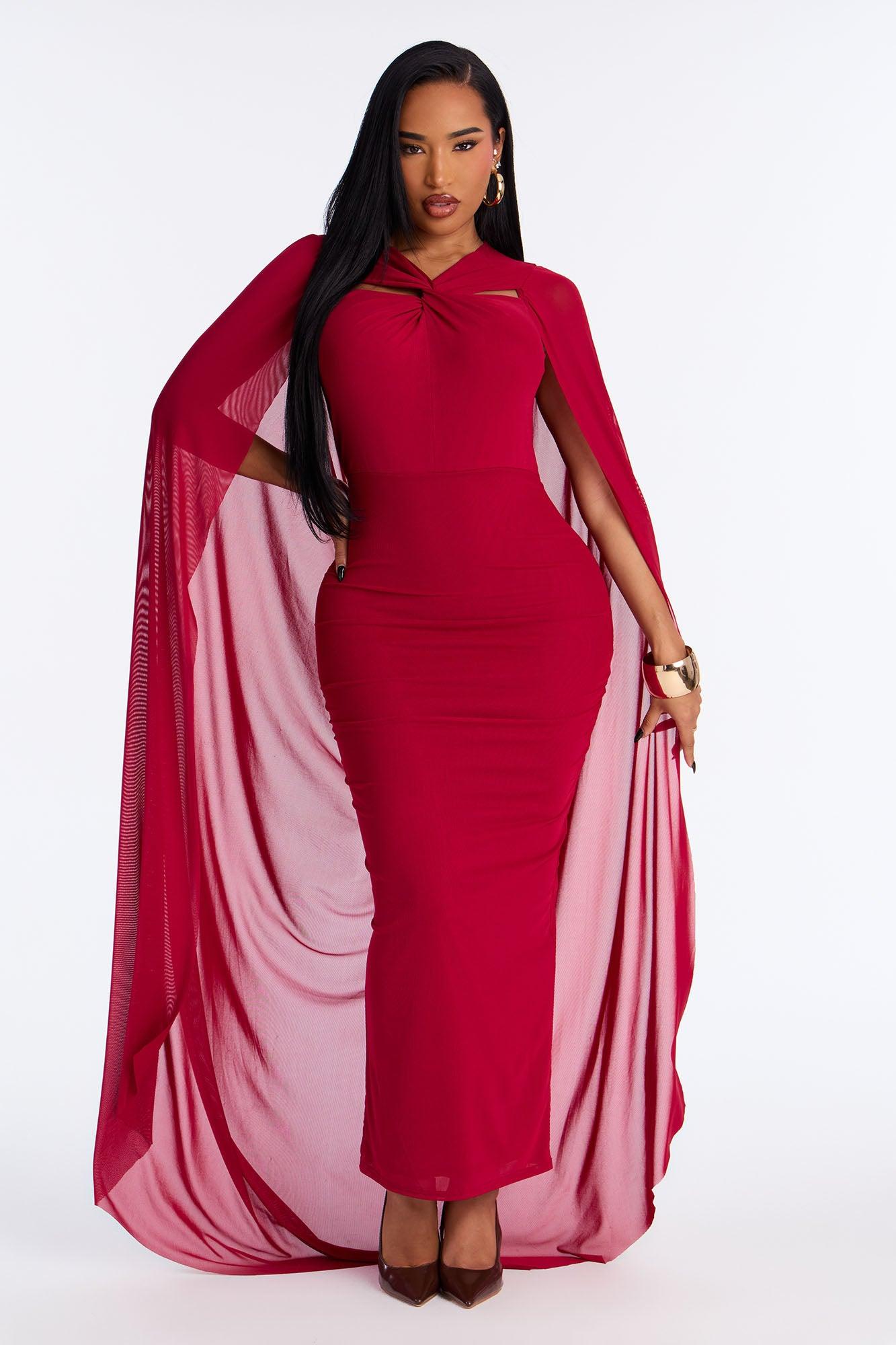 Available In Red. Maxi Gown Sleeveless Y-Neckline Long Sleeve Cape Draped Detail Ruched Hidden Back Zipper Lined Stretch Self: 95% Polyester 5% Spandex Lining: 100% Polyester Imported California Proposition 65WARNING: Cancer and Reproductive Harm - www.P65Warnings.ca.gov.