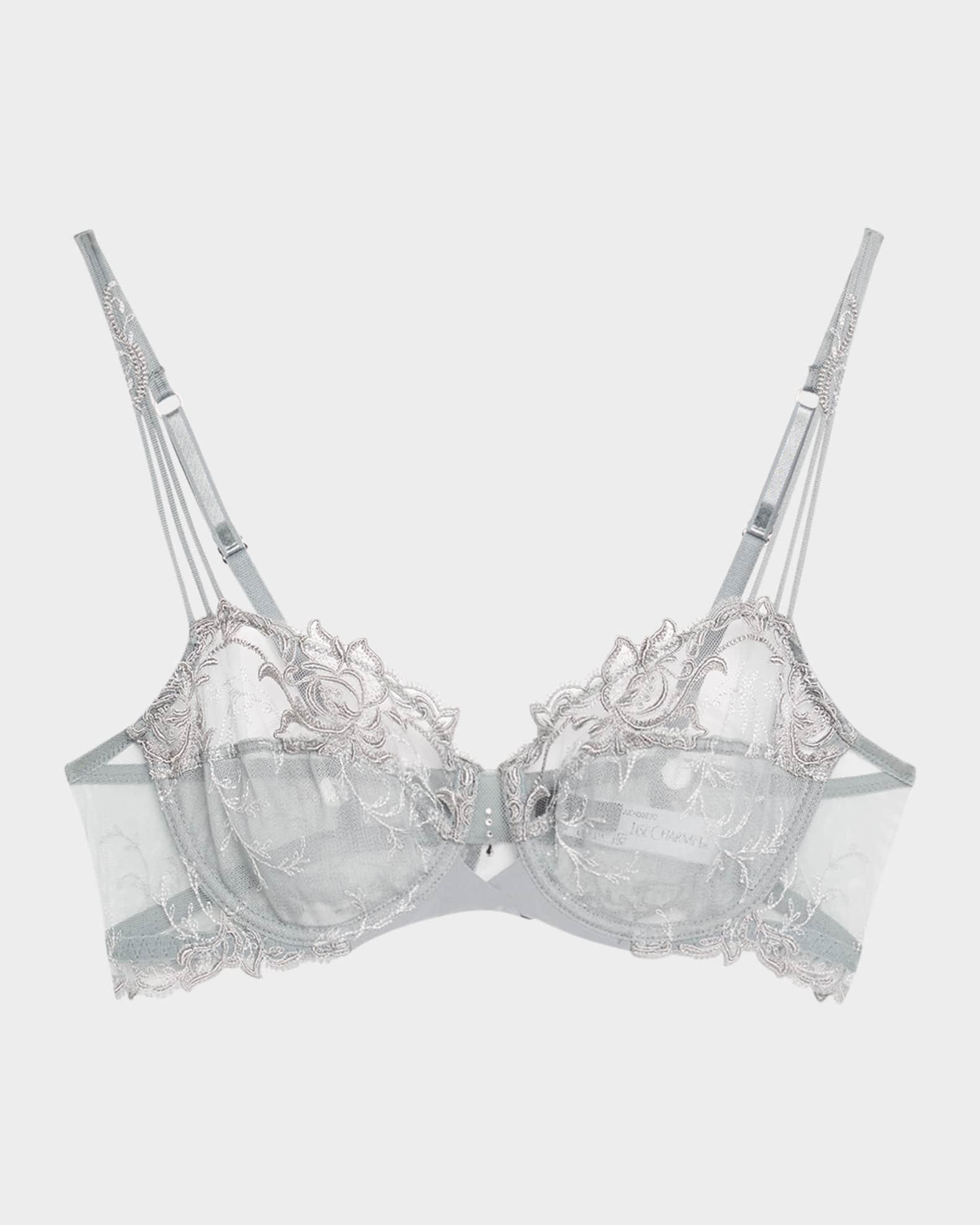 Lise Charmel "Source Beaute" bra in floral-embroidered tulle Underwire two-part demi cups Adjustable shoulder straps Rhinestones at the center gore Hook-and-eye back closure Nylon/polyamide/polyester/elastane Made in Bulgaria Model is 5'10"/177cm.