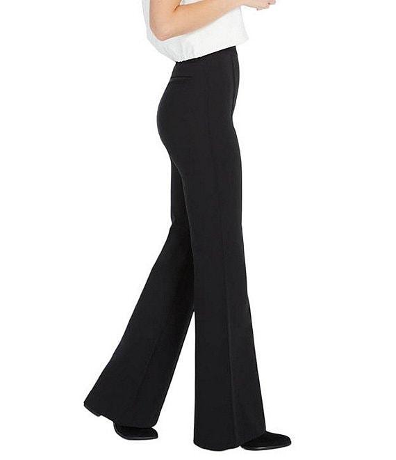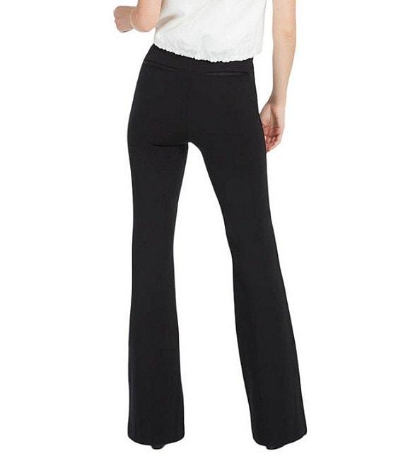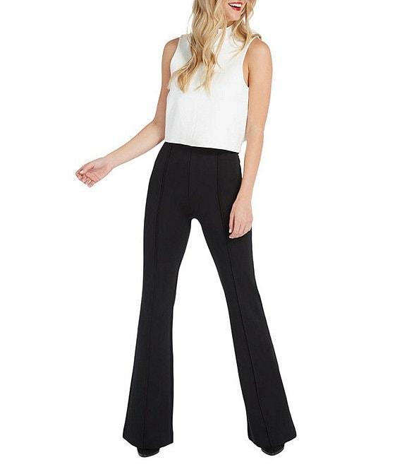 From Spanx, these pants feature: High rise flare leg four-way stretch ponte material hidden tummy shaping pull-on construction body: polyester, rayon, spandex/elastane; lining: nylon/spandex/elastane machine washable/wash cold, gentle cycle, with like colors/inside out/only non-chlorine bleach/tumble dry low Imported.