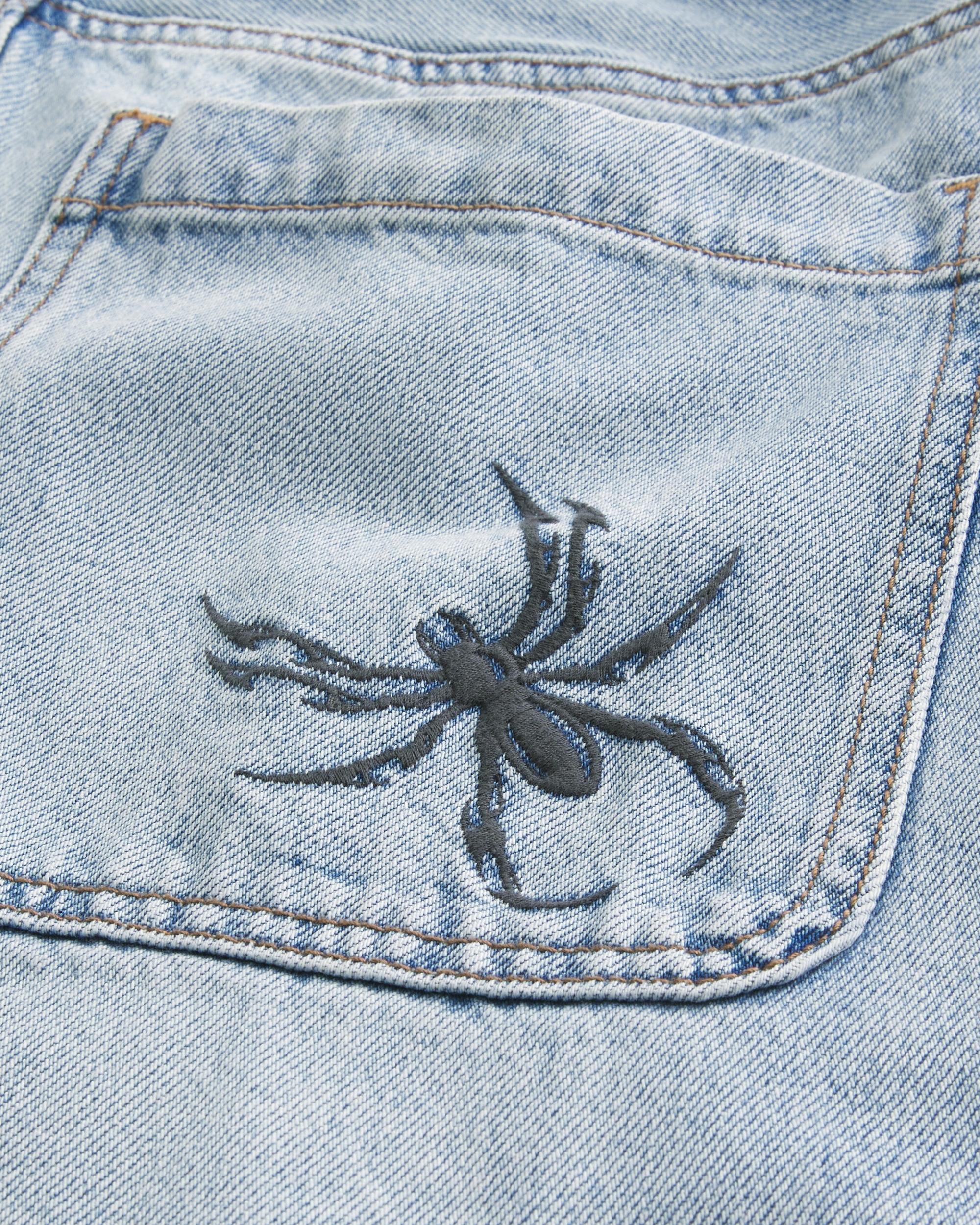 Comfortable denim jeans designed with a baggy leg. Fading, whiskering, embroidered snake graphic at the back pocket.