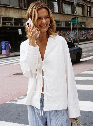 Shirt Oversized fit, classic collar, tie fastening, single breast pocket Non-stretch material, fully lined Princess Polly Lower Impact Main: 95% reclaimed cotton 5% spandex, Lining: 100% reclaimed cotton Cold hand wash