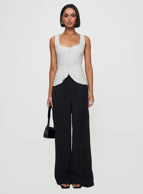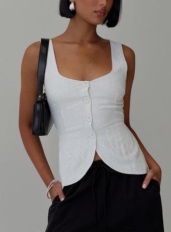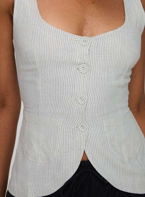 Linen-blend vest top Stripe print, square neckline, button-up closure, twin front pockets, waist tie-back closure Non-stretch material, unlined Princess Polly Lower Impact Main: 60% viscose 40% linen, Lining: 100% cotton Cold gentle machine wash