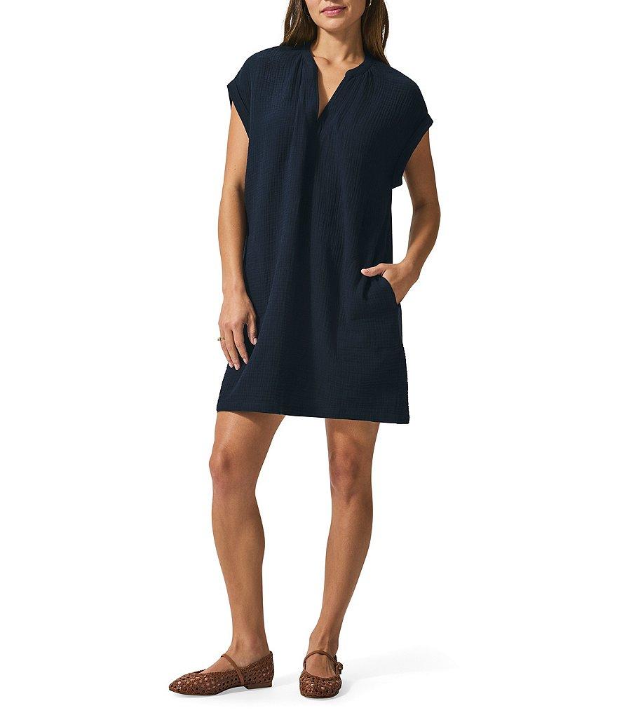From Splendid, this dress features:  Shift silhouette Gauze fabrication  V-neckline Short sleeves Relaxed fit Straight hemline Pullover construction  Approx. 33" in length Cotton Machine wash Imported.