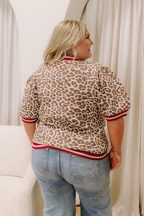 - Be spotted looking chic in this trendy knit top! It adds a bold pop of style to your everyday look. - Unlined knit material with an espresso and iced latte colored leopard print - Red and cream accent stripes on the neckline, cuffs, and hem - A crew cut neckline - Short puff sleeves with ribbed knit cuffs - A relaxed silhouette that ends in a ribbed knit hemline