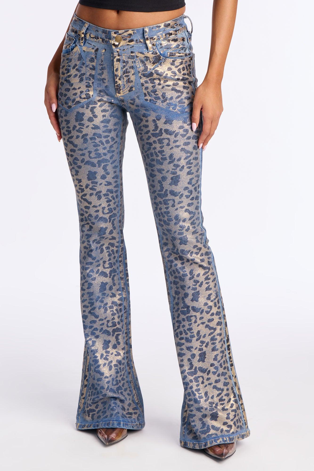Available In Black/combo. Flare Leg Jean 5 Pocket Leopard Print Foil 9" Low Rise 34" Inseam Medium Stretch Disclaimer: Due To The Specialized Wash Process, Each Garment Is Unique. 98% Cotton 2% Spandex Imported California Proposition 65WARNING: Cancer and Reproductive Harm - www.P65Warnings.ca.gov.
