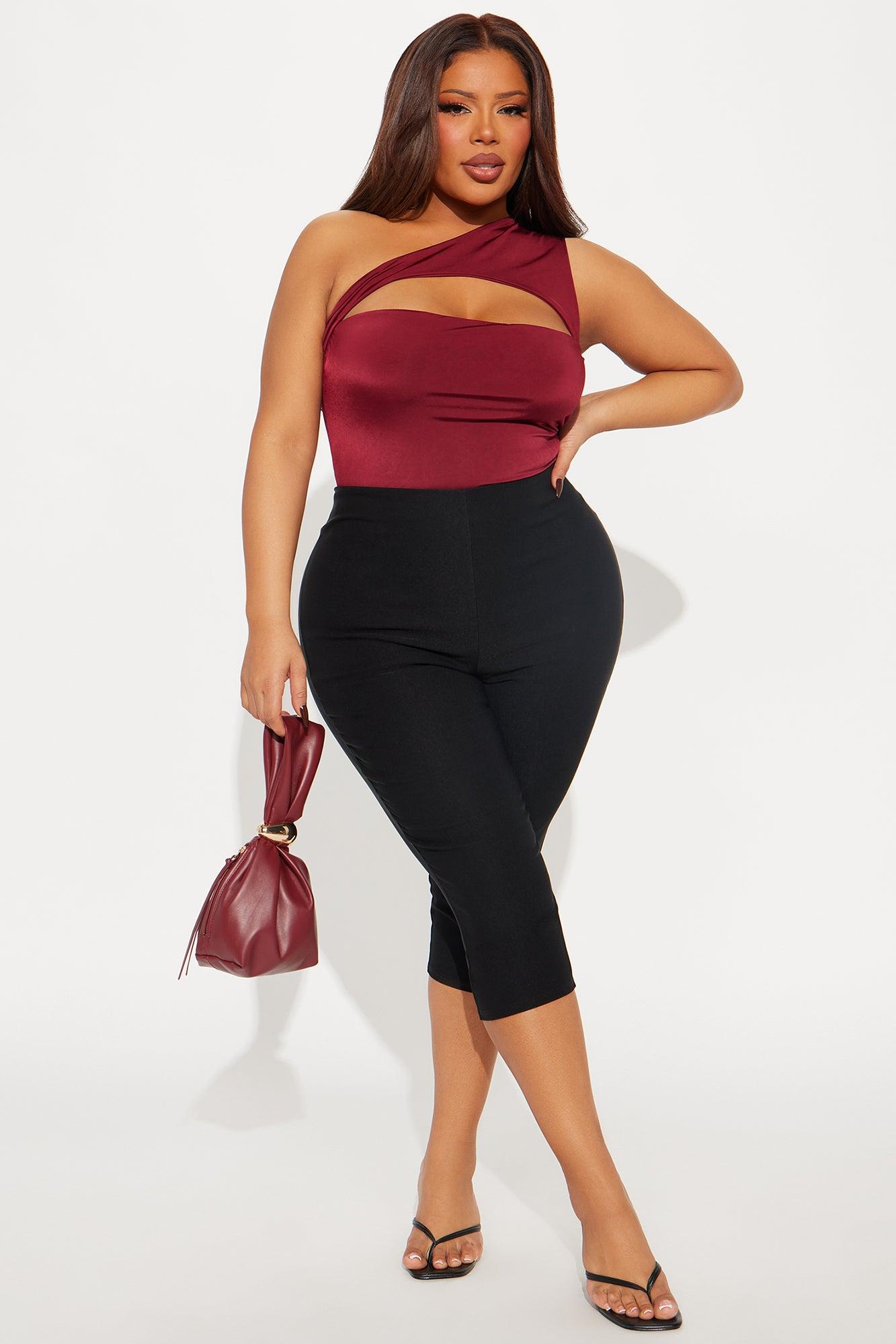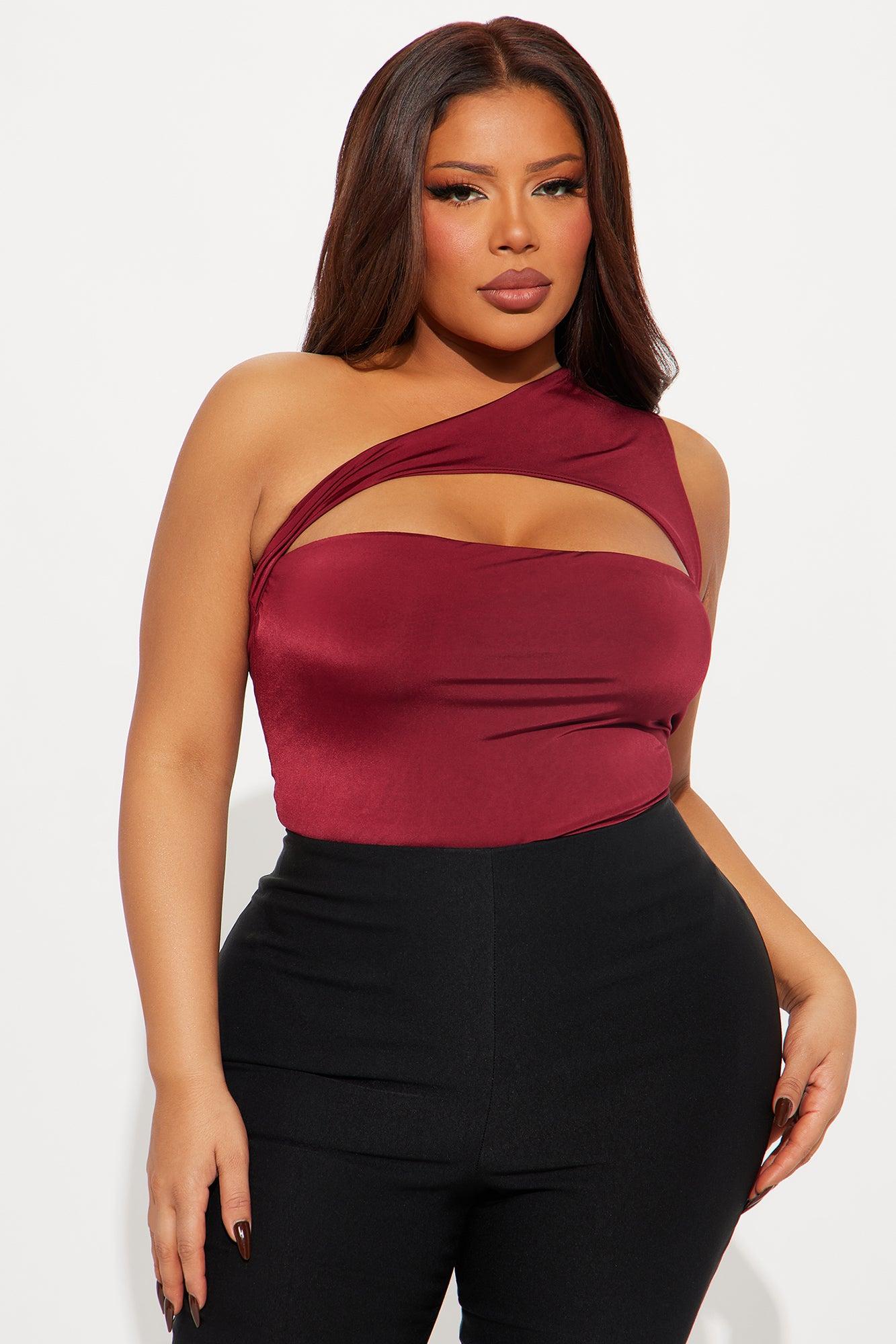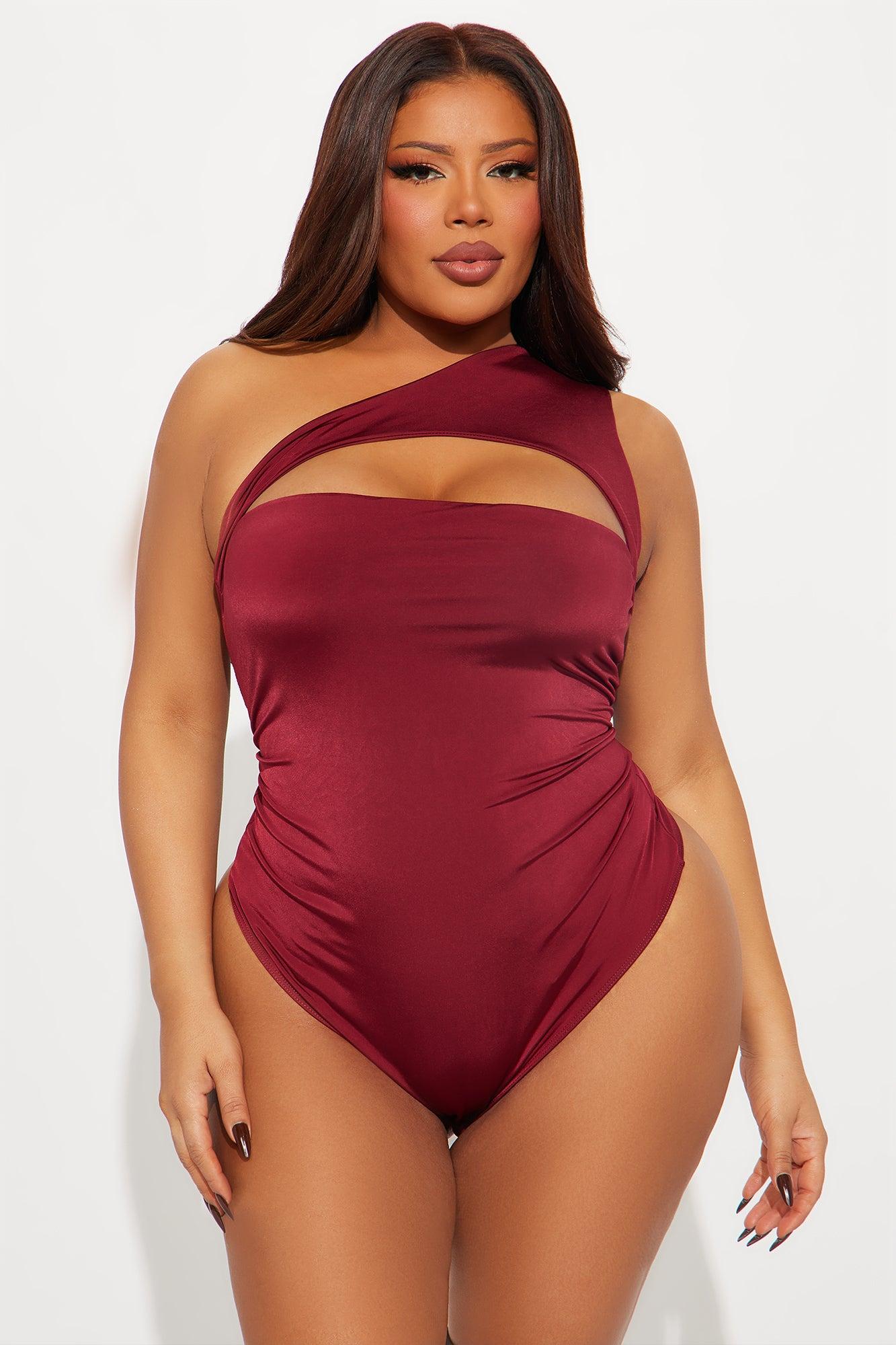Available In Burgundy And Black. One Shoulder Bodysuit Stretch Cut Out Double Lined Front Thong Bottom Snap Closure Final Sale Self: 95% Polyester 5% Spandex Imported California Proposition 65 WARNING: Cancer and Reproductive Harm - www.P65Warnings.ca.gov.