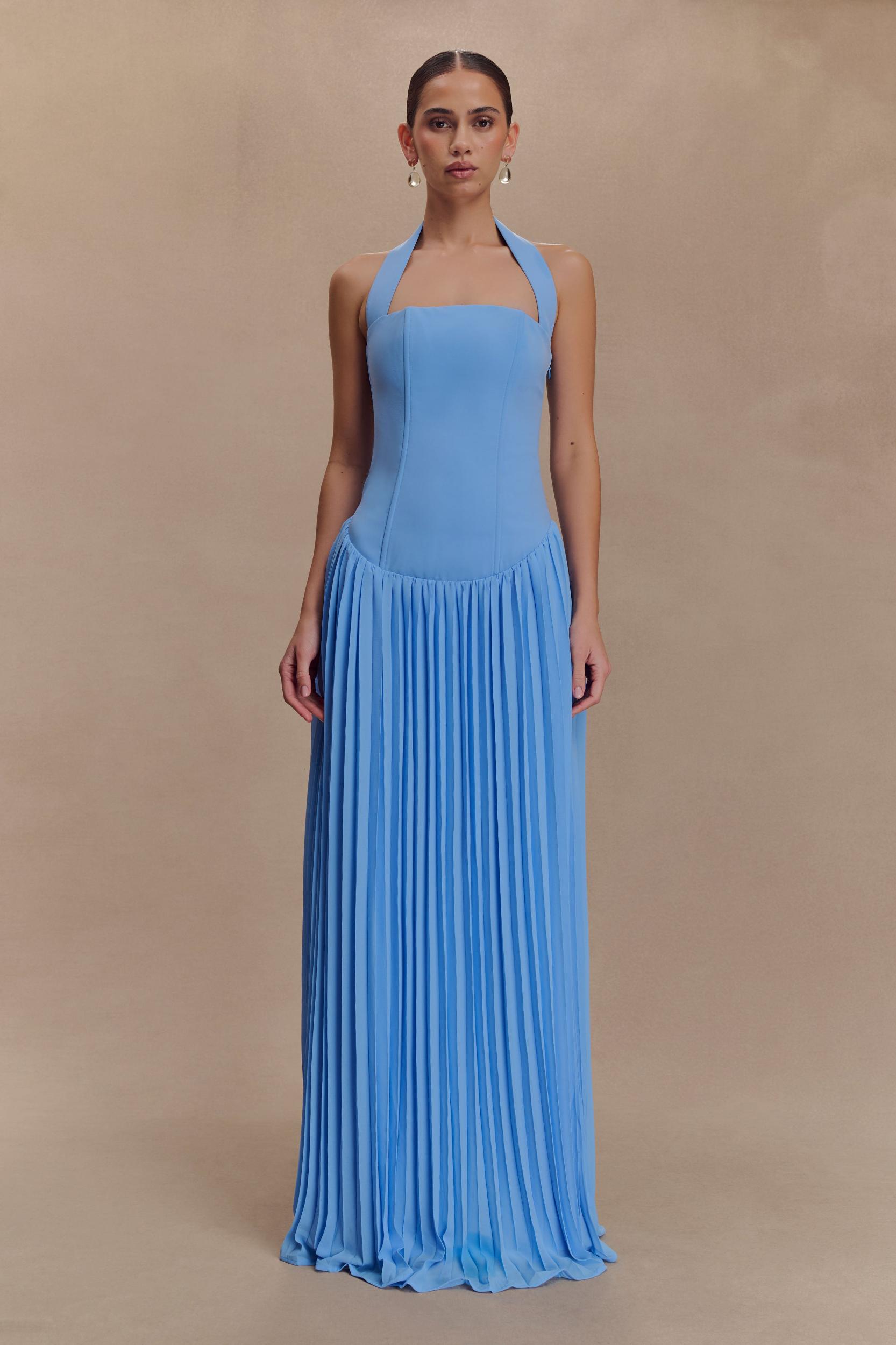 A vision in motion. Make an unforgettable entrance in the STACIE Pleated Halter Maxi Dress, a stunning fusion of structure and fluidity. Designed with a strapless, fitted bodice and internal boning, this dress offers a sculpted silhouette that accentuates your figure. The drop waist transitions seamlessly into a flowing pleated contrast skirt, creating movement with every step. Finished with a discreet side zip for a sleek fit, the Stacie dress is the perfect choice for elegant soirées, weddings, and special occasions where effortless sophistication is key.