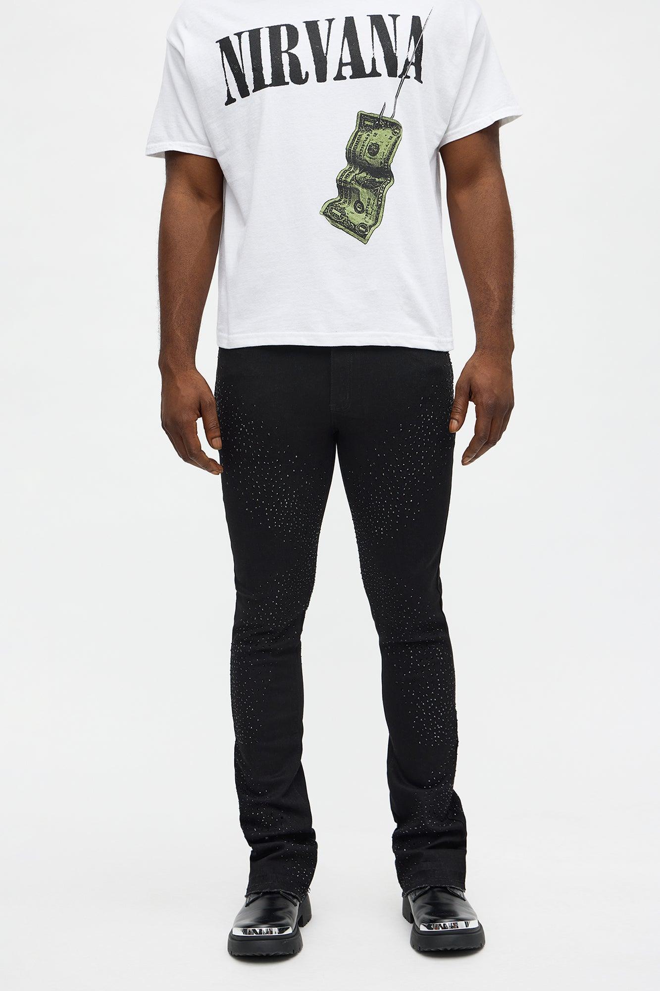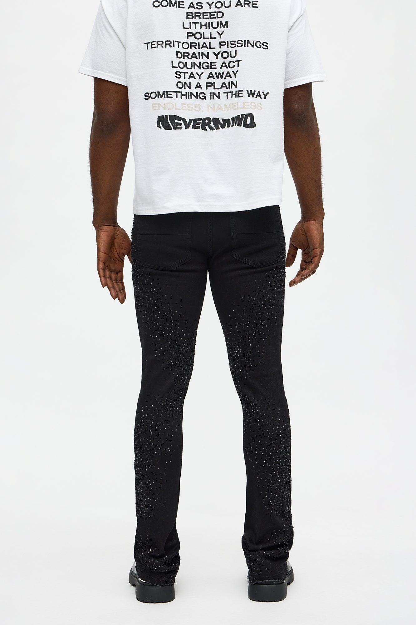 Available In Black, Black Wash And Dark Wash. Stacked Skinny Flared Fit Zip Fly Button Closure 5 Pocket Body Jeweled Details 70% Cotton 28.5% Polyester 1.5% Spandex Imported California Proposition 65WARNING: Cancer and Reproductive Harm - www.P65Warnings.ca.gov.