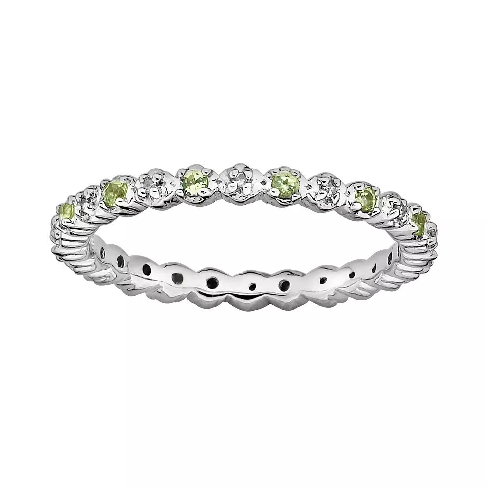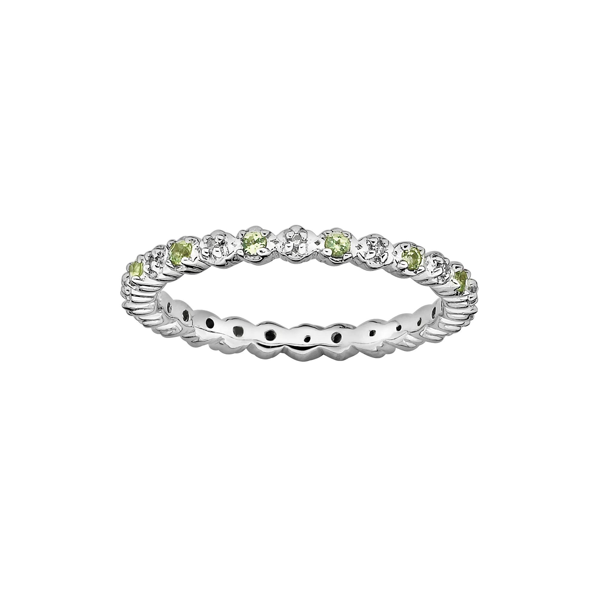 Perfect for a sharp yet chic look this stackable ring is fashioned in sterling silver with gleaming polished finish. From Stackable Expressions, this 2.25mm wide eternity ring features an array of 1/5 ct. t.w. round created green peridot gemstones and sparkling 0.04 ct. t.w. diamonds placed alternatively to enhance your everyday look. Comes in finger size 8, this August birthstone ring can we worn alone or in a group with other rings. | Belk & Co 1/4 Ct. T.w. Peridot And 0.04 Ct. T.w. Diamond Stackable Expressions Ring In Sterling Silver, White, 9