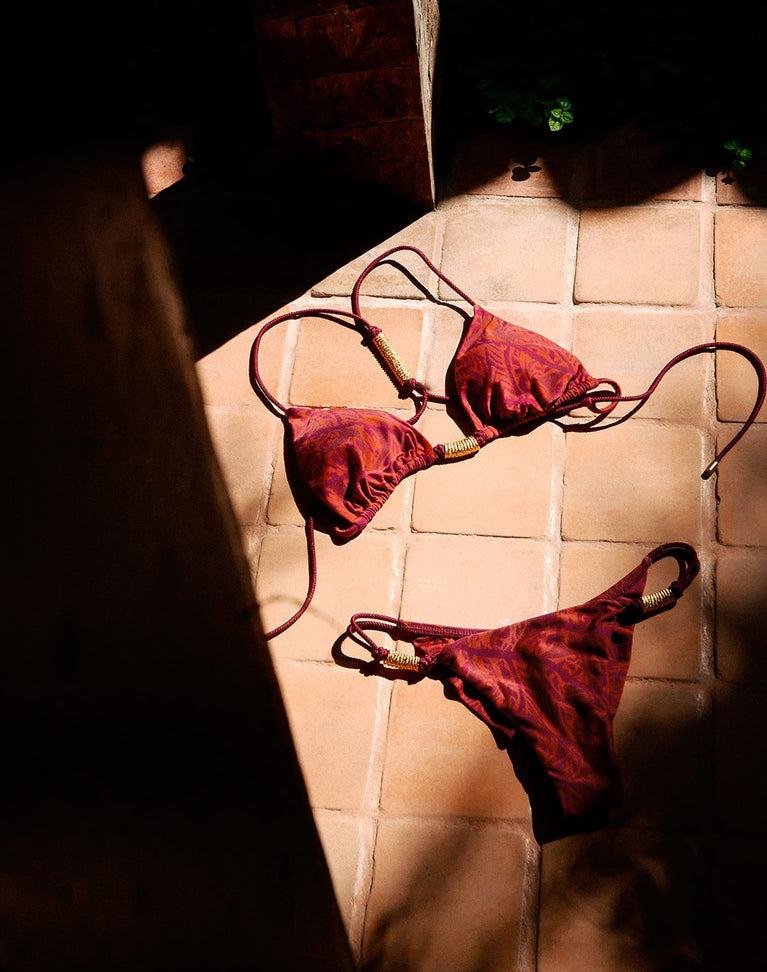 The ViX Stacy T Back Tri Top is a classic triangle bikini top featuring a rustic gold-plated cylindrical design that adorns the front and the back. This popular bikini top silhouette offers excellent lift and support while elongating the back and flattering your natural shape. Style the Stacy T Back Tri Top with a matching bottom and cover up for a vacation-ready look. Features: Triangle style bikini top Gold-plated Stacy details Back tie closures Removable padding Fully lined Style# VH251237