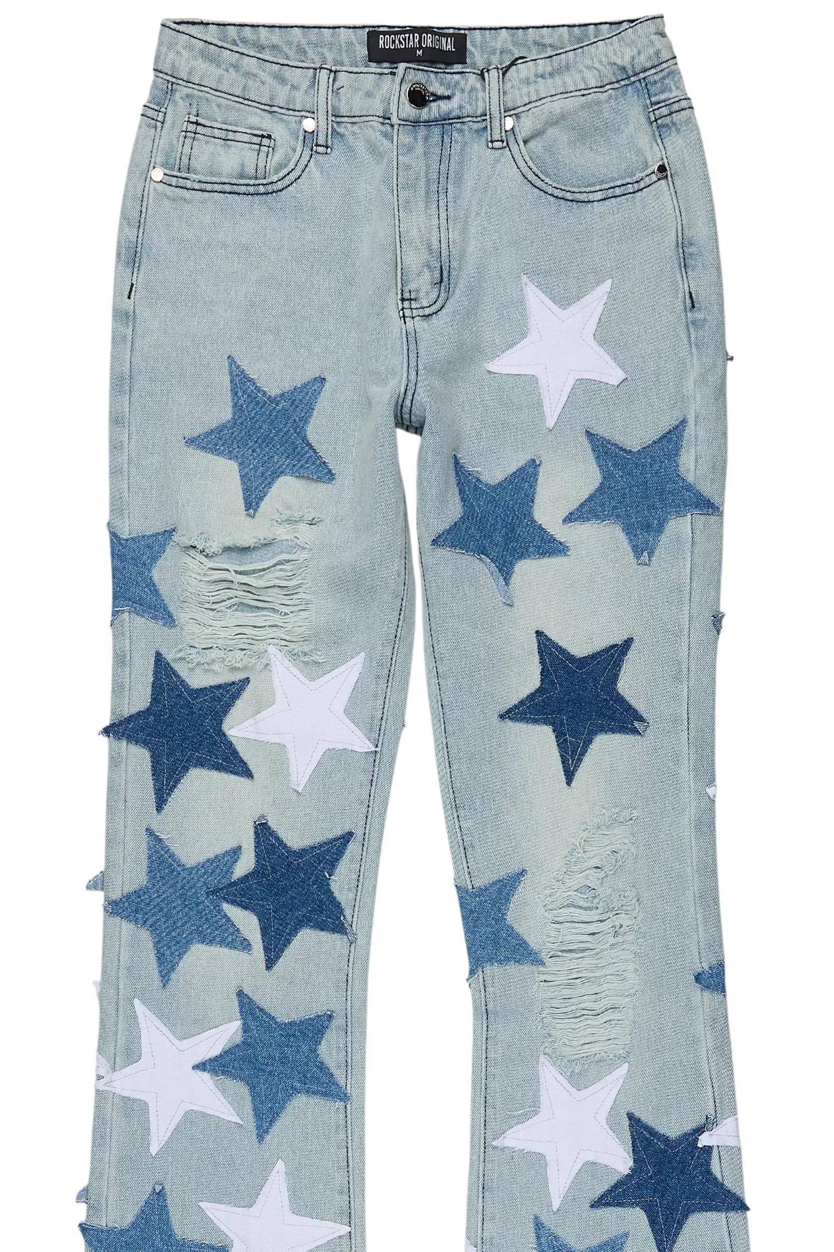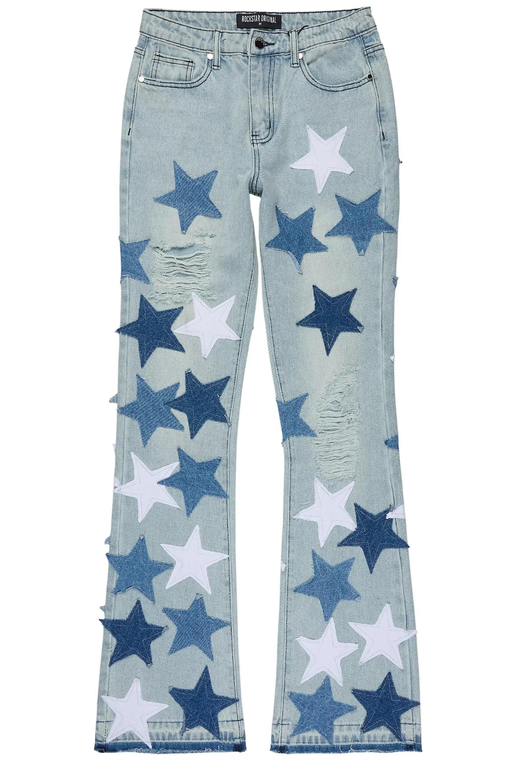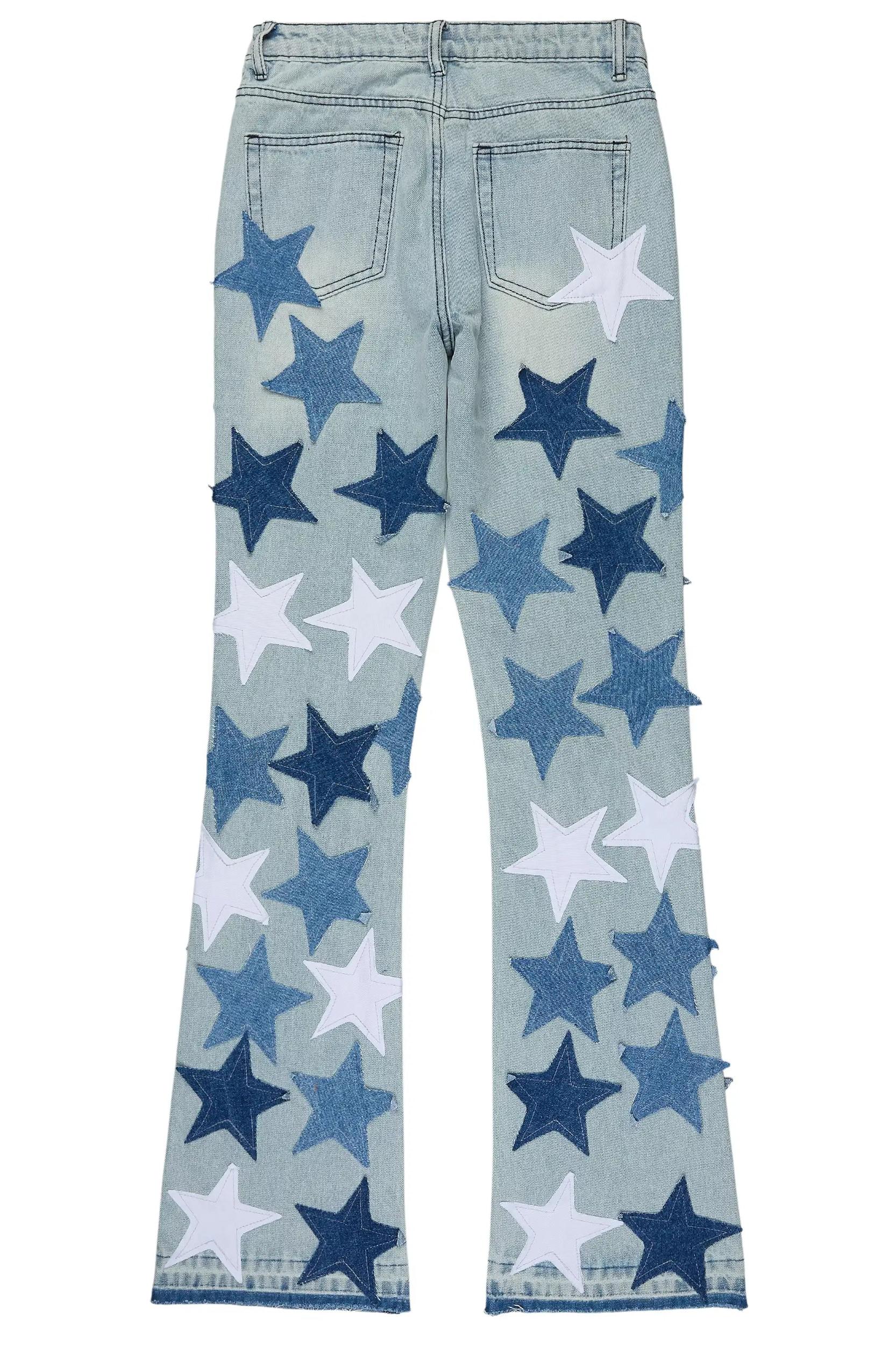 An urban stacked flare denim jean for women in light wash. Designed with organic cotton and extra long legs for an essential streetwear style. Zip fly with button closure 5-pocket build Distressed detailing Bootcut silhouette Stacked construction Custom patchwork Flared leg openings 36" seams *NOTE: These jeans are non-stretch; we recommend sizing up for a looser fit.