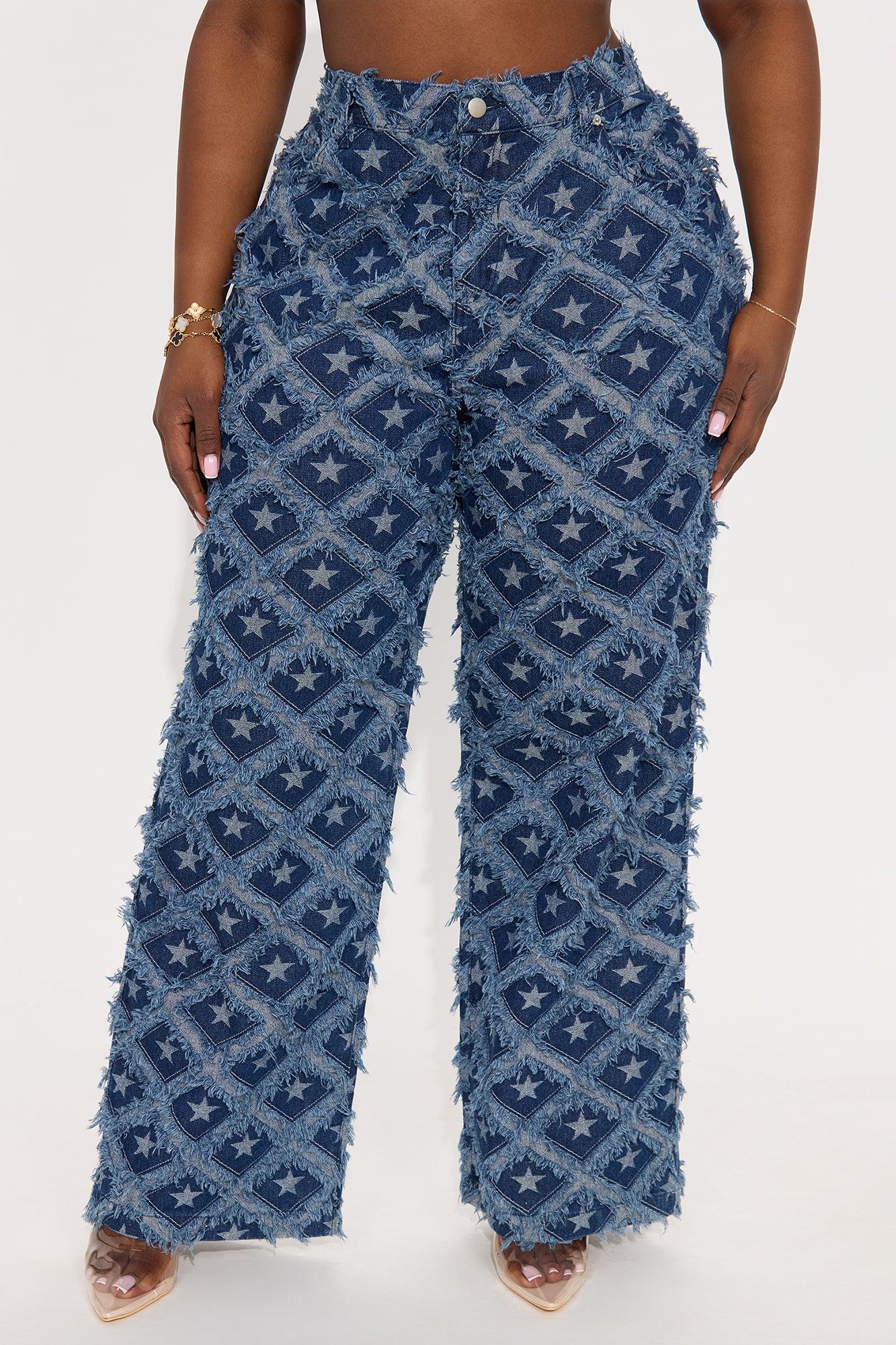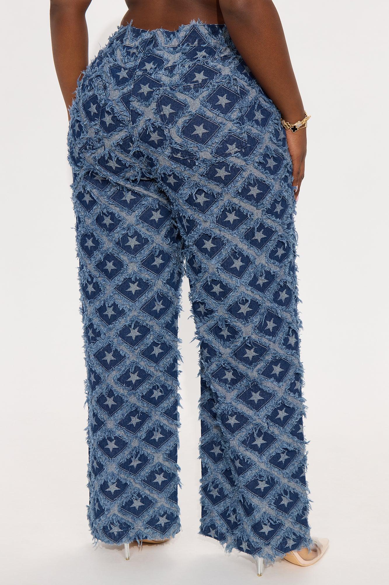Available In Dark Wash. Straight Leg Jean 5 Pocket Shredded Detail Jacquard Star Pattern 12.5" Inseam 32" Rise Non-Stretch Disclaimer: Due To The Specialized Wash and Frayed Detail Each Garment Is Unique. 85% Cotton 15% Polyester Imported