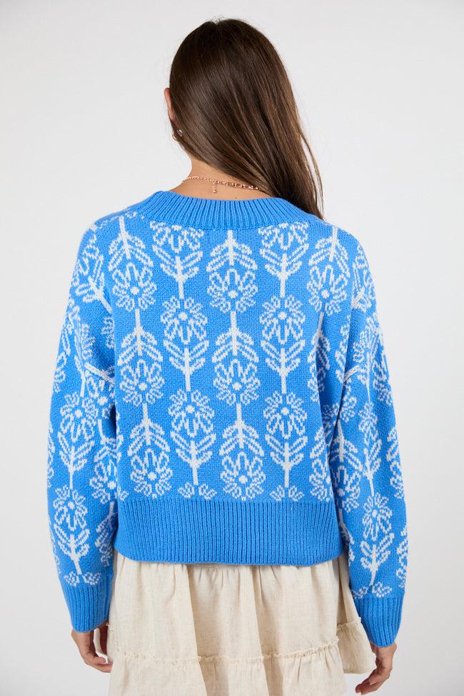 Details Blue Block Floral Print Cardigan Fabric has stretch V-neckline, functional button up closure, ribbed hem Unlined Size small from shoulder to hem: 17.5" Material and Care 100% acrylic Hand wash cold, dry flat Patterns may vary Materials may have natural variations Colors may vary from different viewing devices.