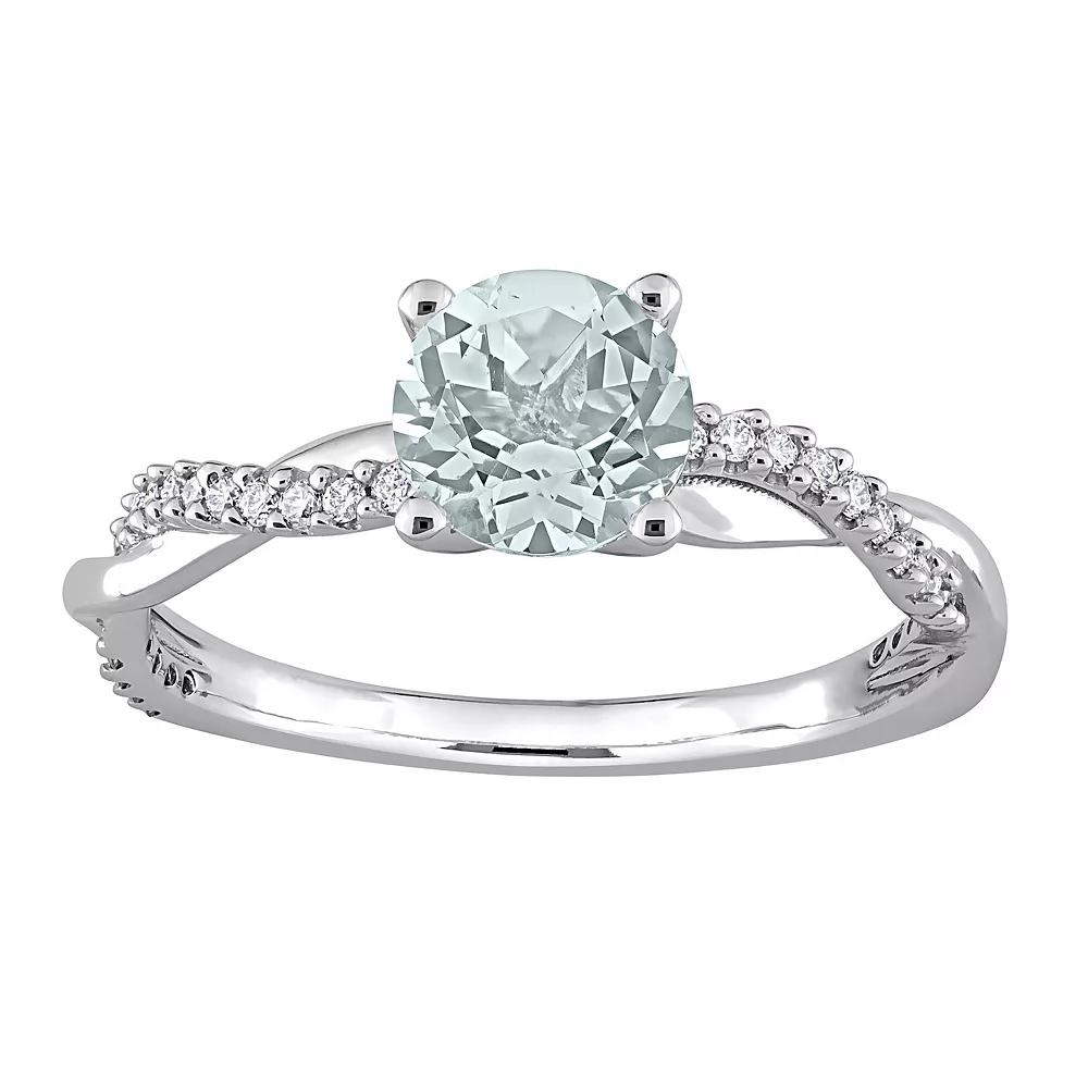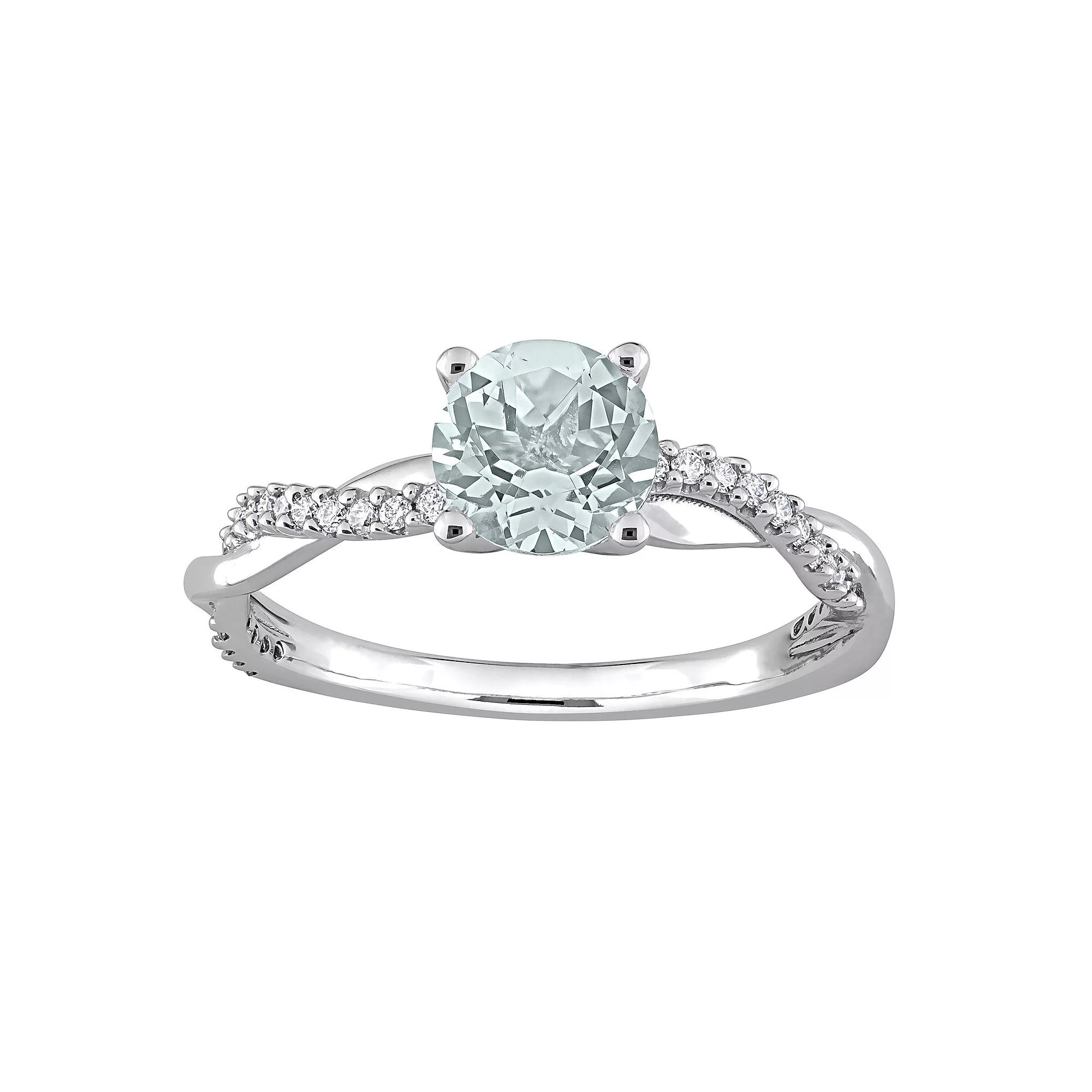 Adorned with a round-cut aquamarine center stone accented with a swirl of shimmering diamonds, this Stella Grace engagement ring is a beautiful symbol of your love. Adorned with a round-cut aquamarine center stone accented with a swirl of shimmering diamonds, this Stella Grace engagement ring is a beautiful symbol of your love. Metal: 14k white gold Packaging: boxed Plating: rhodium Width: 6.5 mm Finish: polishedSTONE DETAILS Stone type: aquamarine Total weight: 1 ct. Center stone size: 6.5 mm x 6.5 mm Shape: round Setting: prongDIAMOND DETAILS Total weight: 1/6 ct. Shape: round Setting: pave Gemstones may have been treated to enhance their appearance. Special care may be required. Please visit our Gemstone Treatment & Special Care Guide for more information. Image(s) may be enlarged to show detail. Please note, due to the high value of this item, a signature may be required upon delivery. Color: Blue. Gender: female. Age Group: adult.
