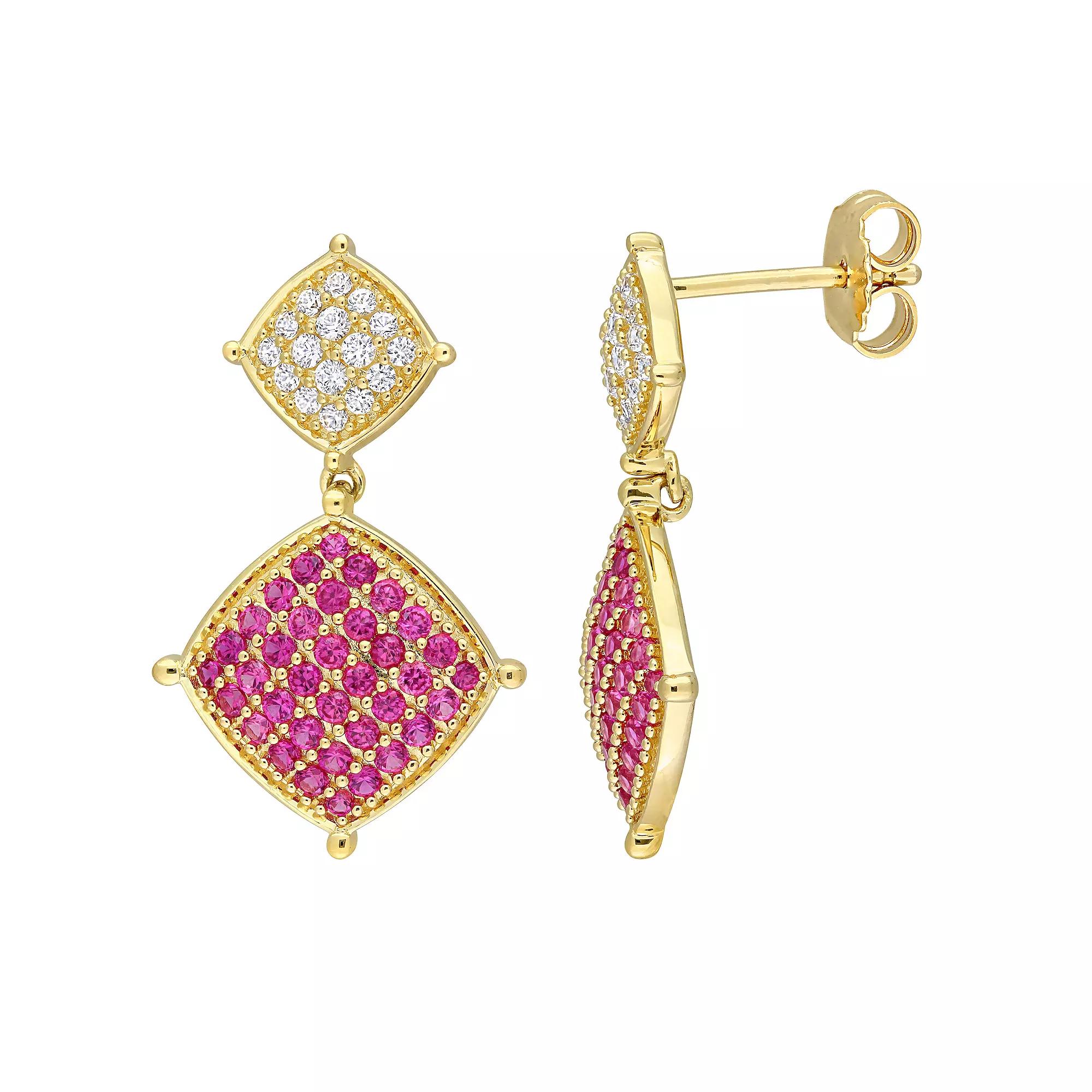 Chic and unique, these lab-created ruby and lab-created white sapphire Stella Grace earrings complete your vibrant look. Chic and unique, these lab-created ruby and lab-created white sapphire Stella Grace earrings complete your vibrant look. Nickel free Metal: sterling silver Backings: post Packaging: boxed Plating: gold tone Finish: polished Length: 3.4 mmSTONE DETAILS Stone type: lab-created ruby, lab-created white sapphire Total weight: 1 3/4 ct. Shape: round Setting: pave Gemstones may have been treated to enhance their appearance. Special care may be required. Please visit our Gemstone Treatment & Special Care Guide for more information. Please note, due to the high value of this item, a signature may be required upon delivery. Size: One Size. Gender: female. Age Group: adult. Material: Gold Over Sterling.
