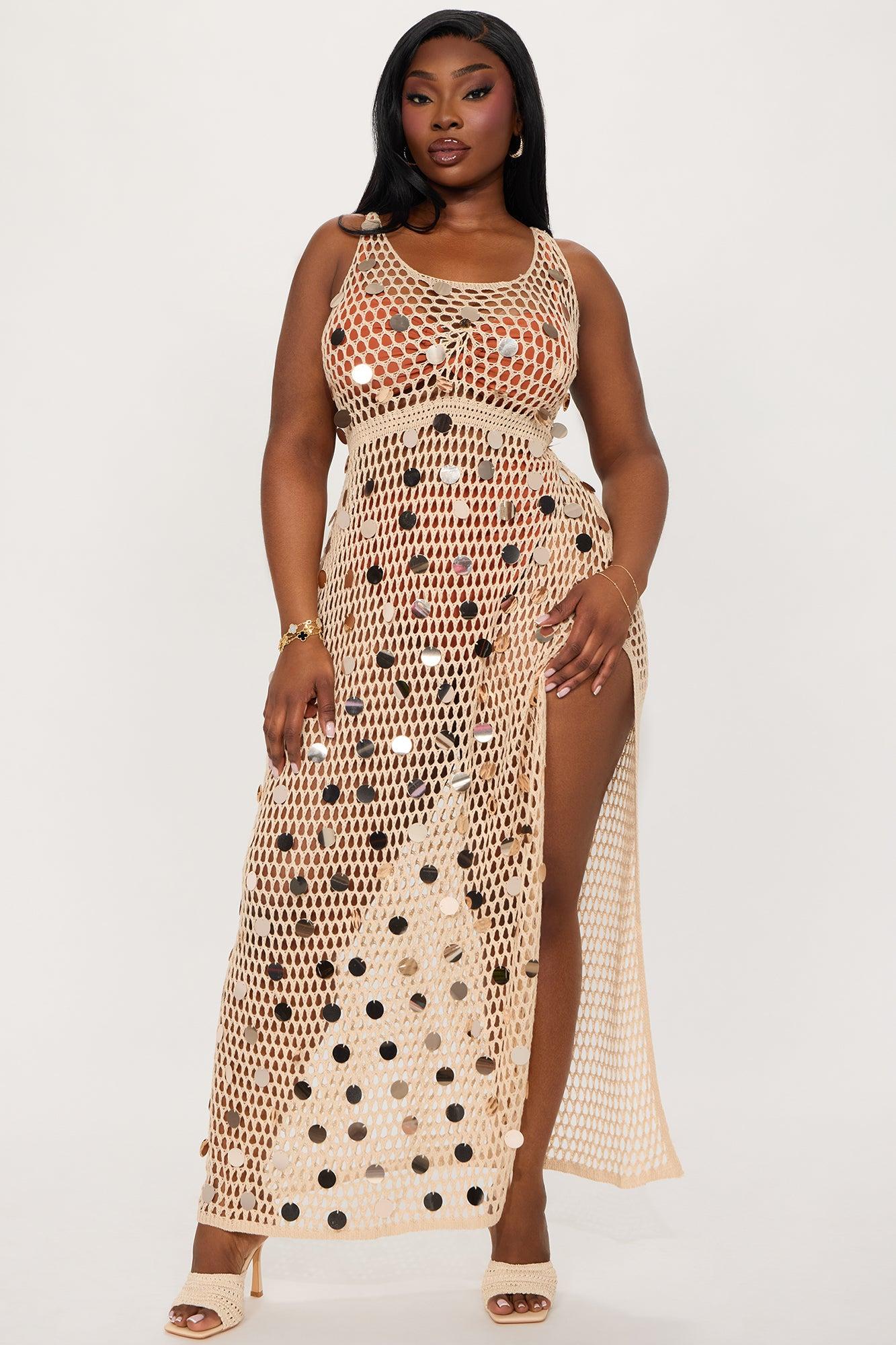 Available In Gold. Swim Cover Up Maxi Dress Crochet Sequin Detail Side Slit Full Stretch Final Sale 100% Acrylic Imported