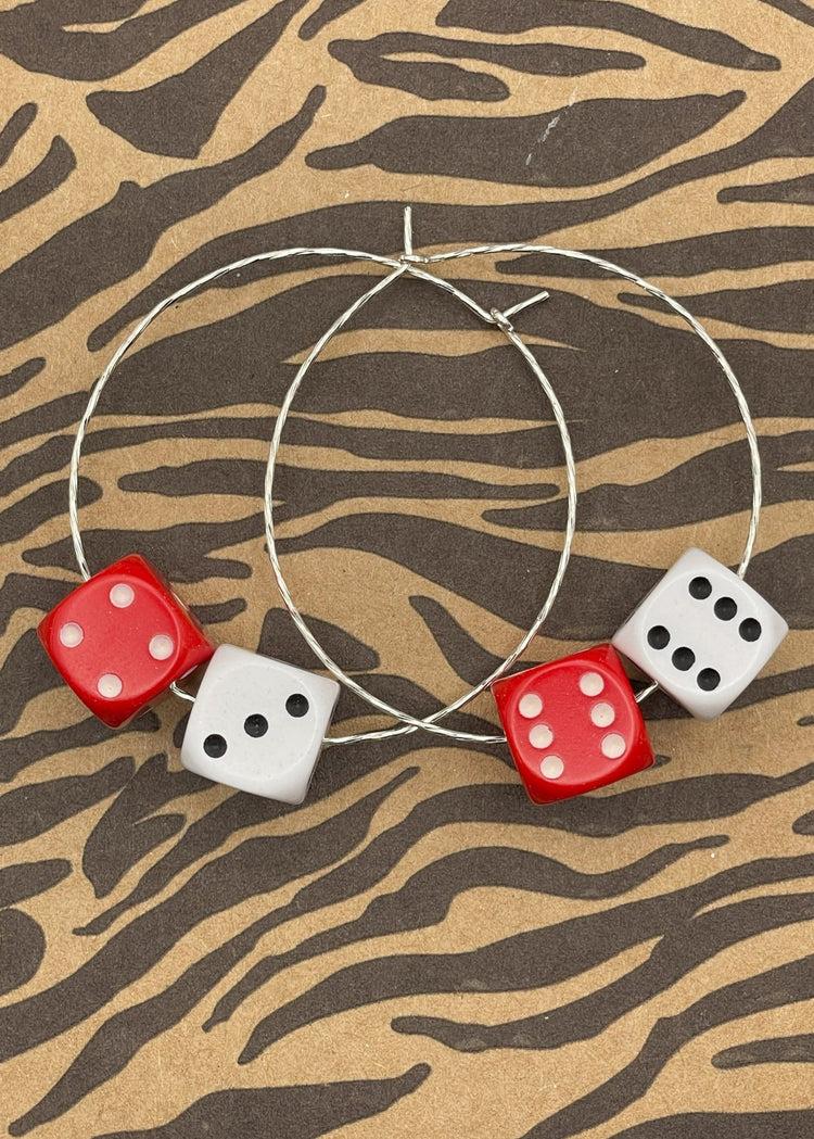Handmade in California by Bog-Art-Studio, these sterling silver hoop earrings feature real double dice, symbolizing luck and adventure. The sleek hoops elegantly showcase the dangling dice, blending edginess with timeless style. Symbolizing luck, fate, and bold decisions, these earrings embody the thrill of taking chances. Inspired by Las Vegas, they’re a stylish tribute to fortune, courage, and living life boldly. 925 Sterling SilverHoop Diameter: 1.8"Care: Gently clean with jewelry polishing cloth.Made in USADesigner: Brigitte BogartEach piece is handmade and unique so may vary slightly from the photo.