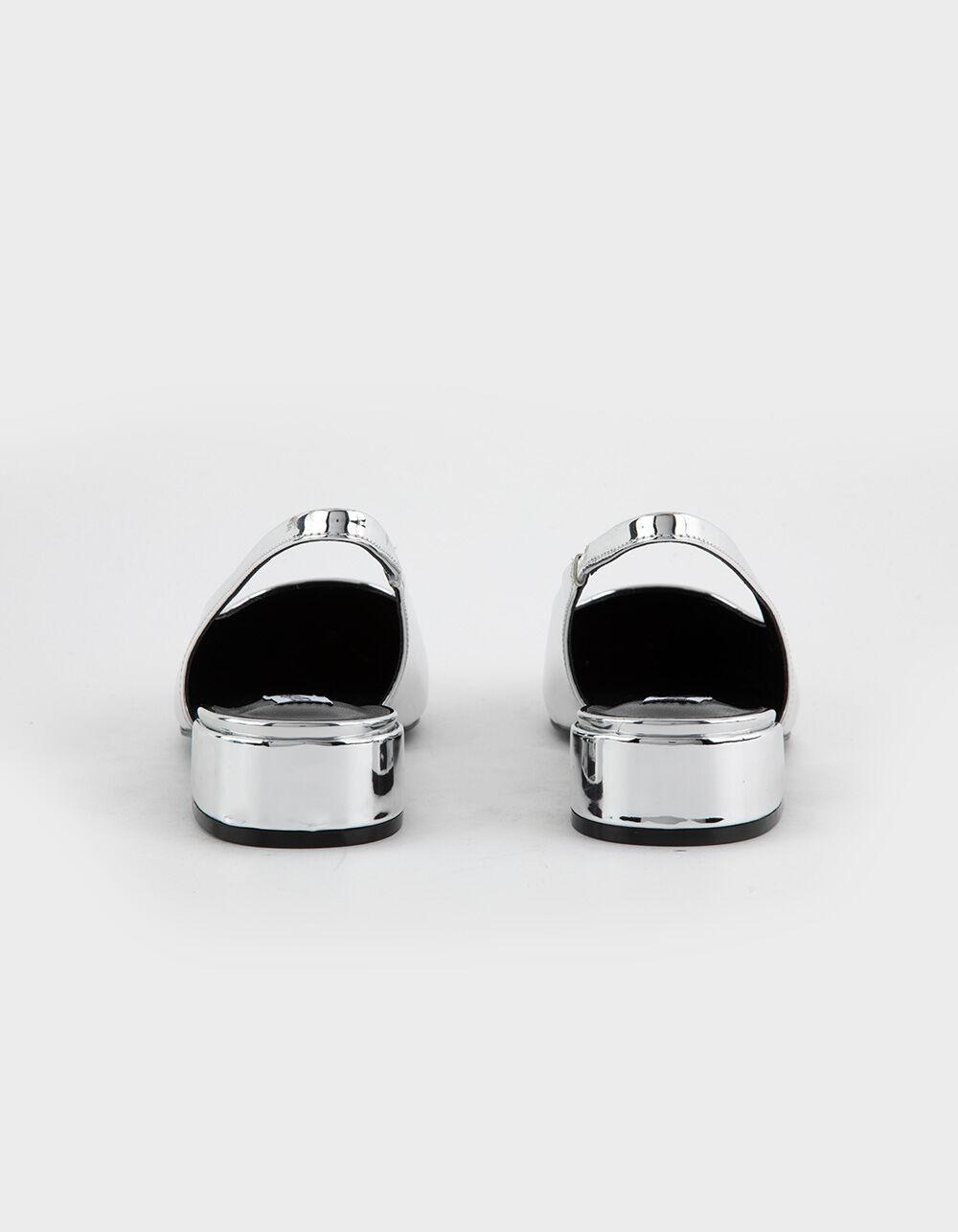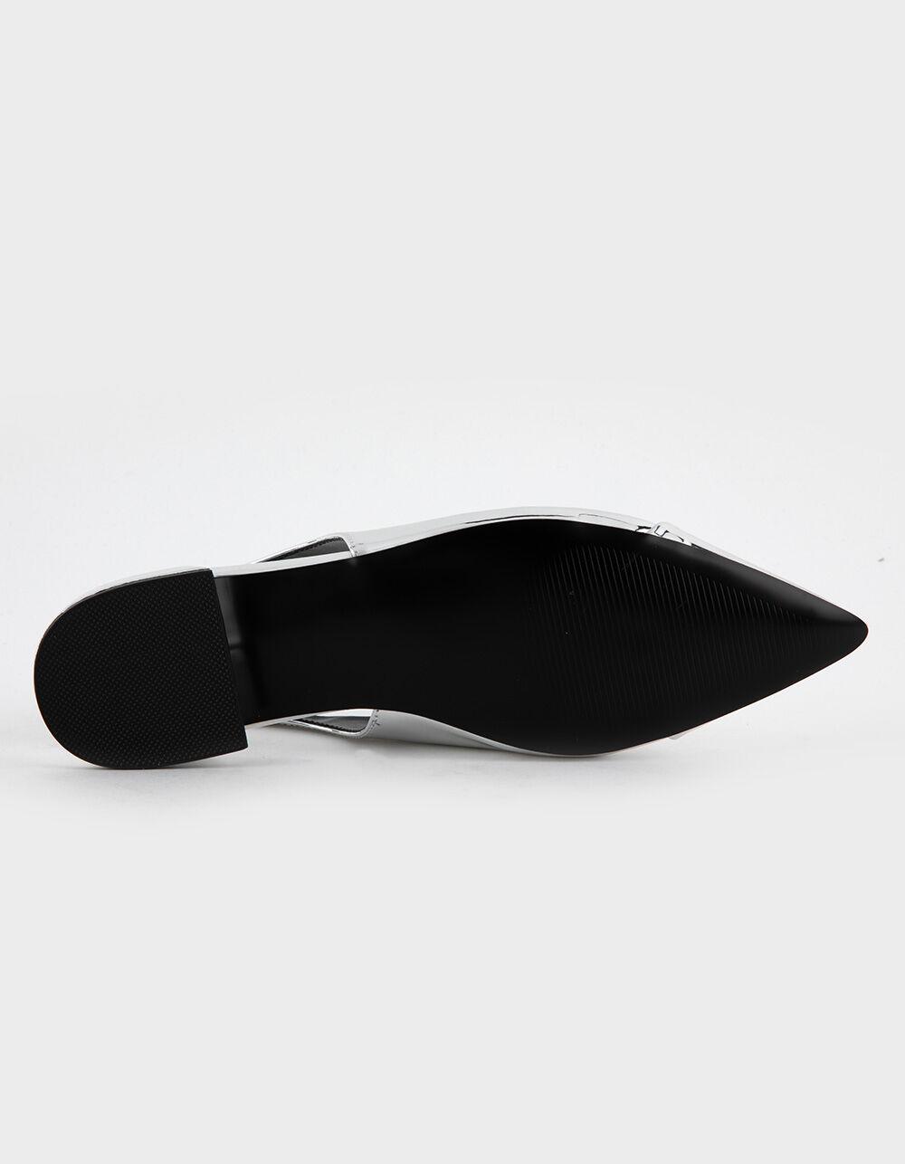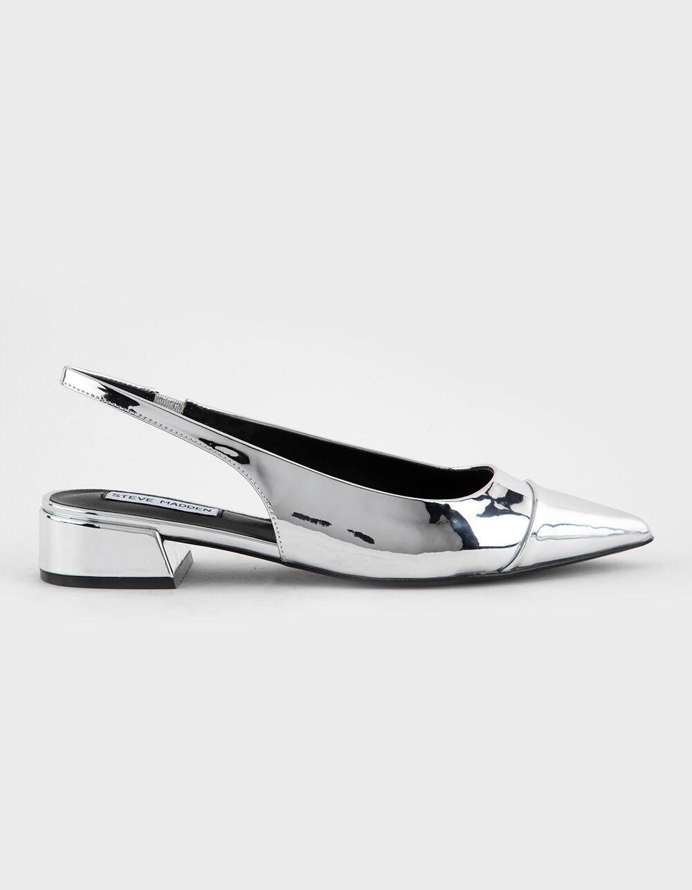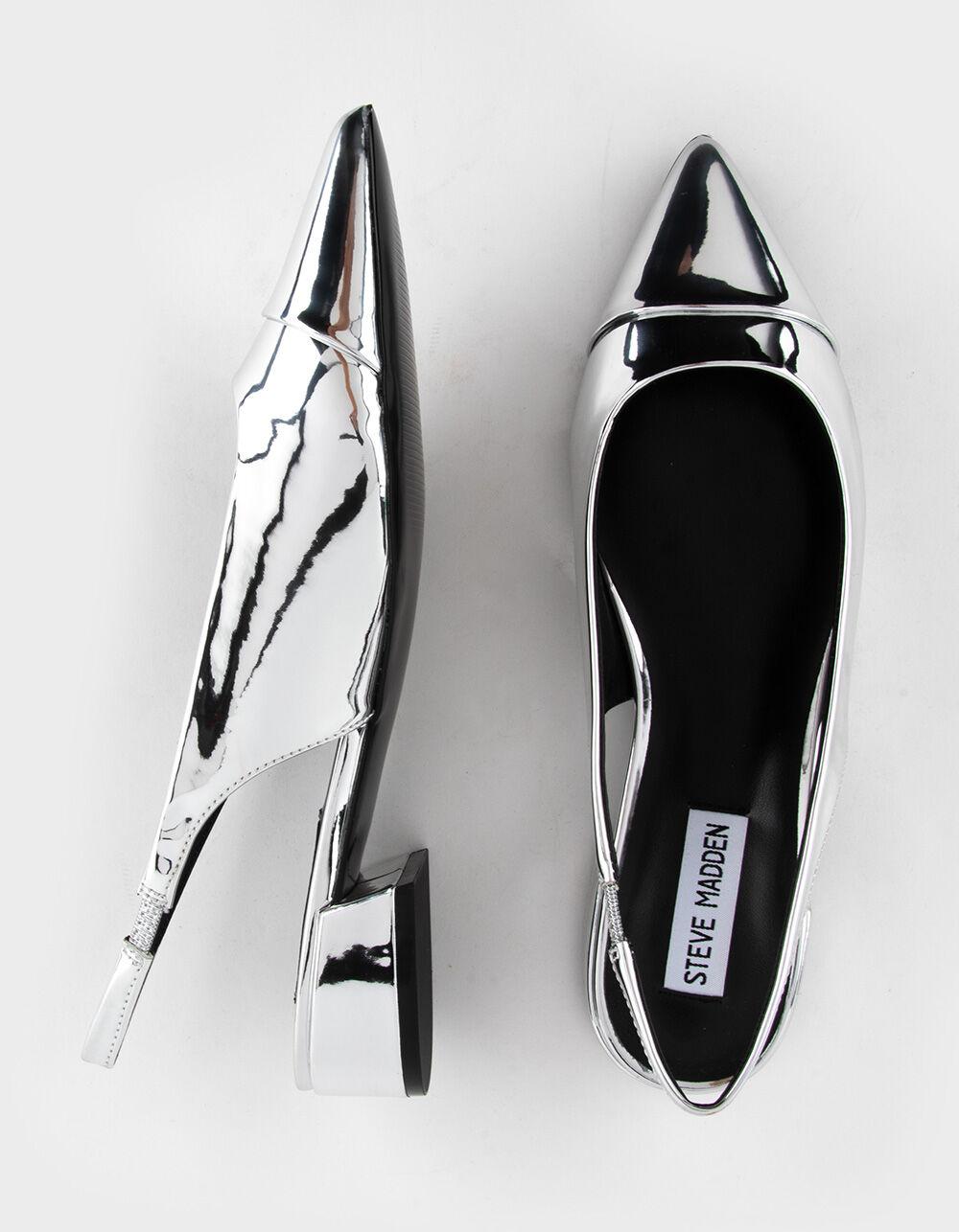 Steve Madden Christann Slingback Block Heel Shoes. Crafted with a sleek silver metallic upper, these shoes add a dazzling statement to any outfit. Featuring a comfortable block heel and adjustable slingback strap, these shoes offer both style and support for all-day wear. Pointed toe. Cushioned footbed. Synthetic lining, sock, and sole. 1'' heel height. Imported.