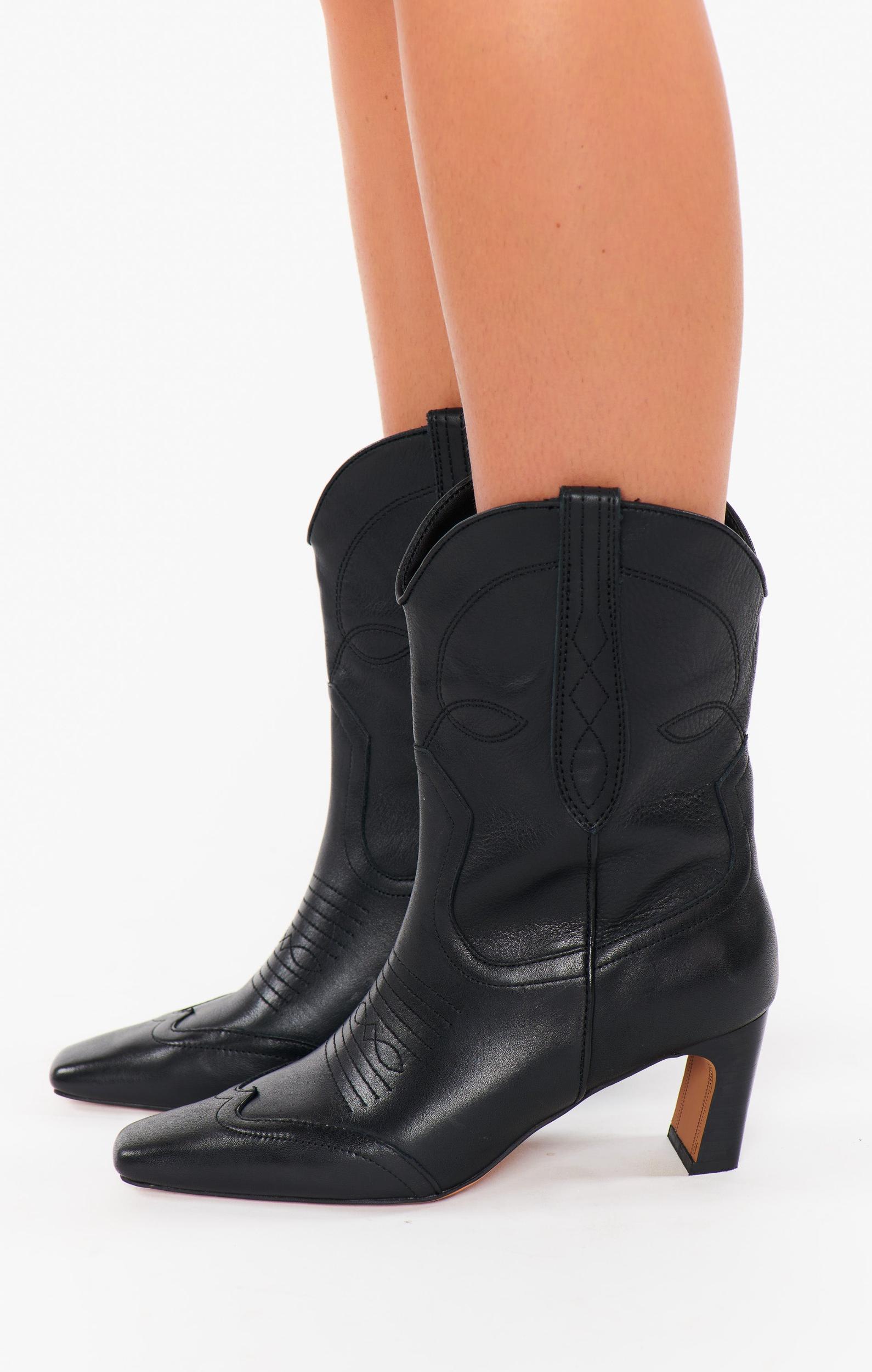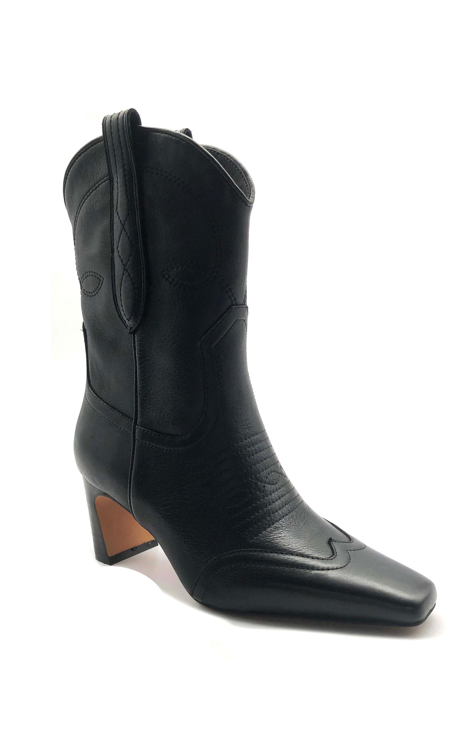 Decorative stitching and a curved topline add Western-inspired elements to a trend-savvy boot balanced by a slender square toe and demiblock heel.