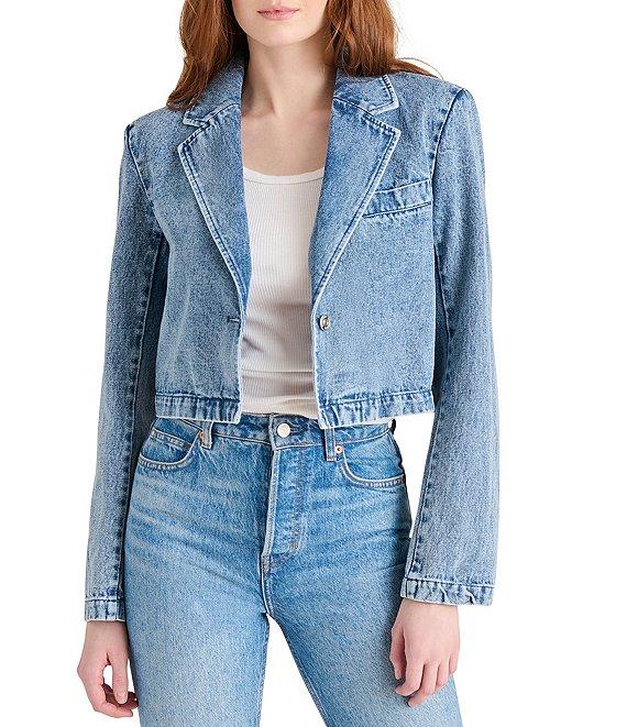 From Steve Madden, this jacket features: Denim fabrication Notch lapel neckline Long sleeves Center front button closure Approx. 19" length Cotton Machine wash Imported.