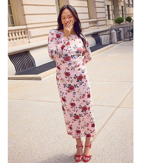 Stevie by Steve Madden Floral Printed Boat Neck Long Sleeve Low Back Ruched Dress