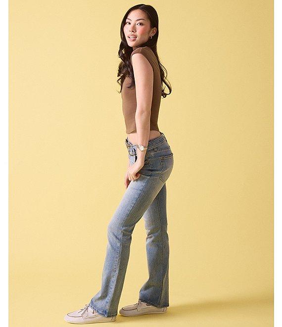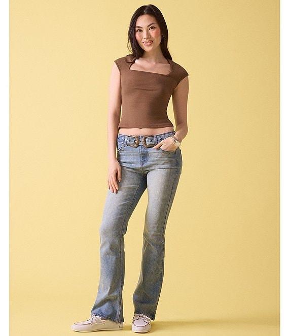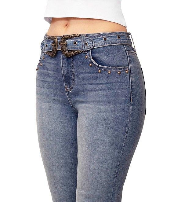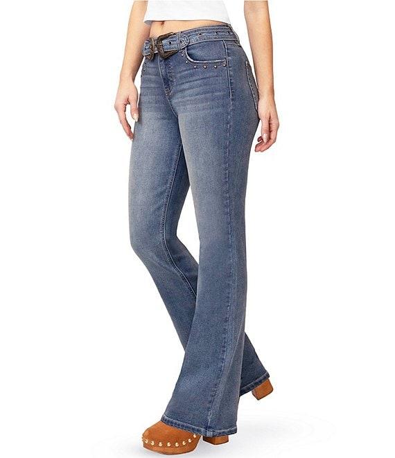 From Stevie Jeans By Steve Madden, these jeans feature: High rise Zip/button front closure Belt loops Studded detailing Self belt Bootcut Cotton/polyester/rayon/spandex denim Machine wash/tumble dry Imported.