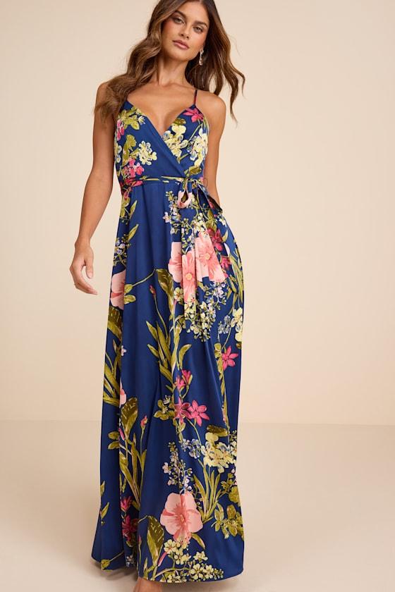A bright floral print sweeps across this glossy woven dress that falls from slender adjustable spaghetti straps into a surplice bodice with a backless design and a sash tie at the waist. A flowing A-line skirt falls to a maxi hem, while a thigh-high side slit creates elegant movement. Hidden back zipper.