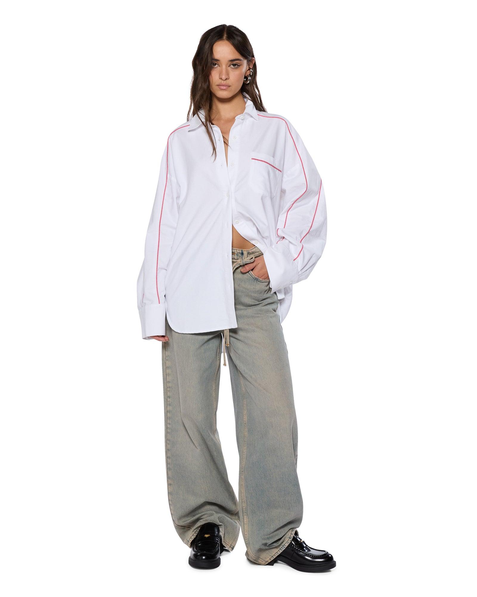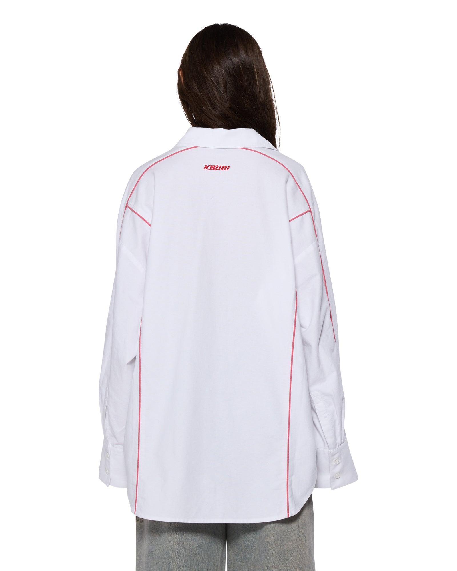 The Stinger Astra LS Shirt White/Red is an oversized button-up shirt made from premium 100% cotton oxford shirting fabric. It features a patch pocket, curved hem, and a classic center front collar with elongated cuffs, designed with contrast piping on sleeves and back panels. Finished with a seasonal Ksubi art hit at back neck and Ksubi T-box and Cross dollar embroidery.