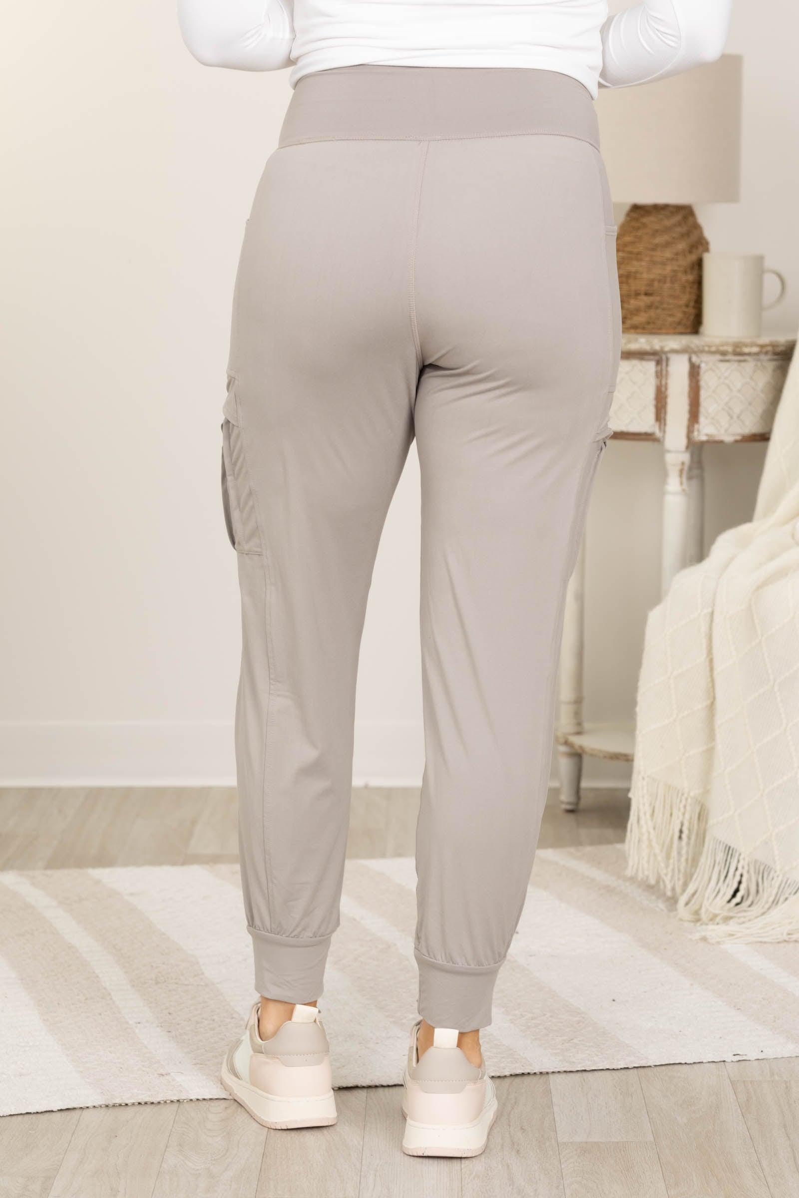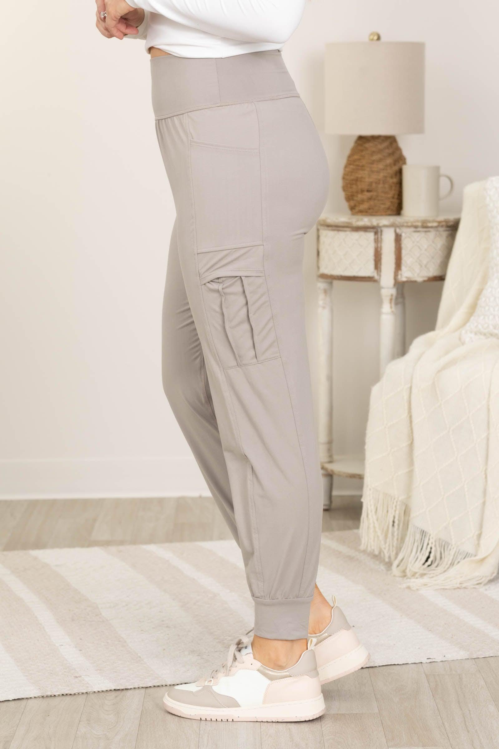 Product Details Colors: Stone Grey Print: Solid Style: Joggers with Side Pocket Brand: Rae Mode Material and Care 84% Recycled Polyester Microfiber 16% Spandex Machine Wash Cold Tumble Dry Low Size and Fit Small: Waist 28" Rise 13" Inseam 28" Medium: Waist 30" Rise 13" Inseam 28" Large: Waist 32" Rise 13.5" Inseam 28" 1XL: Waist 34" Rise 14" Inseam 29" 2XL: Waist 36" Rise 14.5" Inseam 29" 3XL: Waist 38" Rise 14.5" Inseam 29"