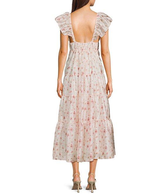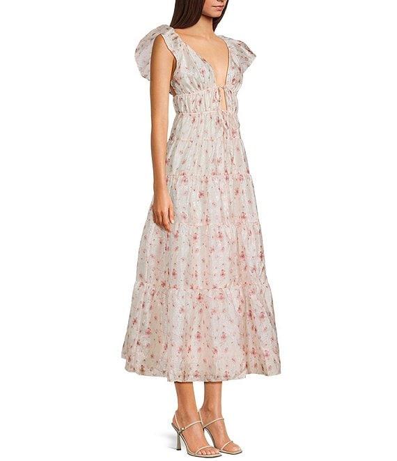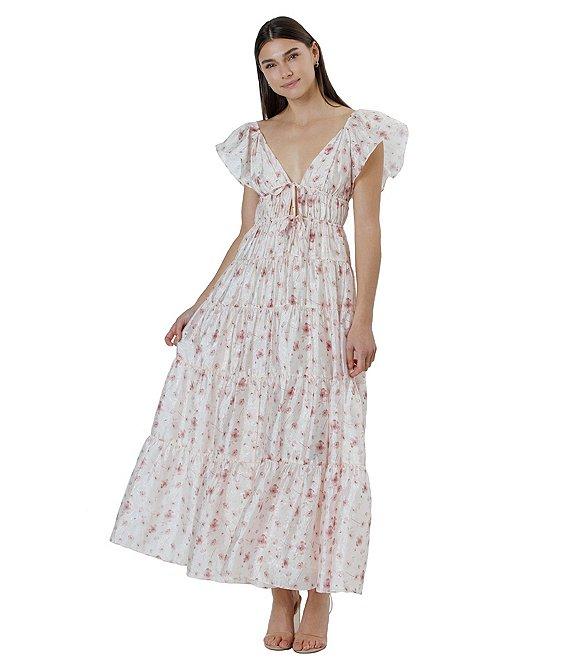 Storia Floral Print Deep V-Neck Tie Front Flutter Sleeve Tiered Maxi Dress