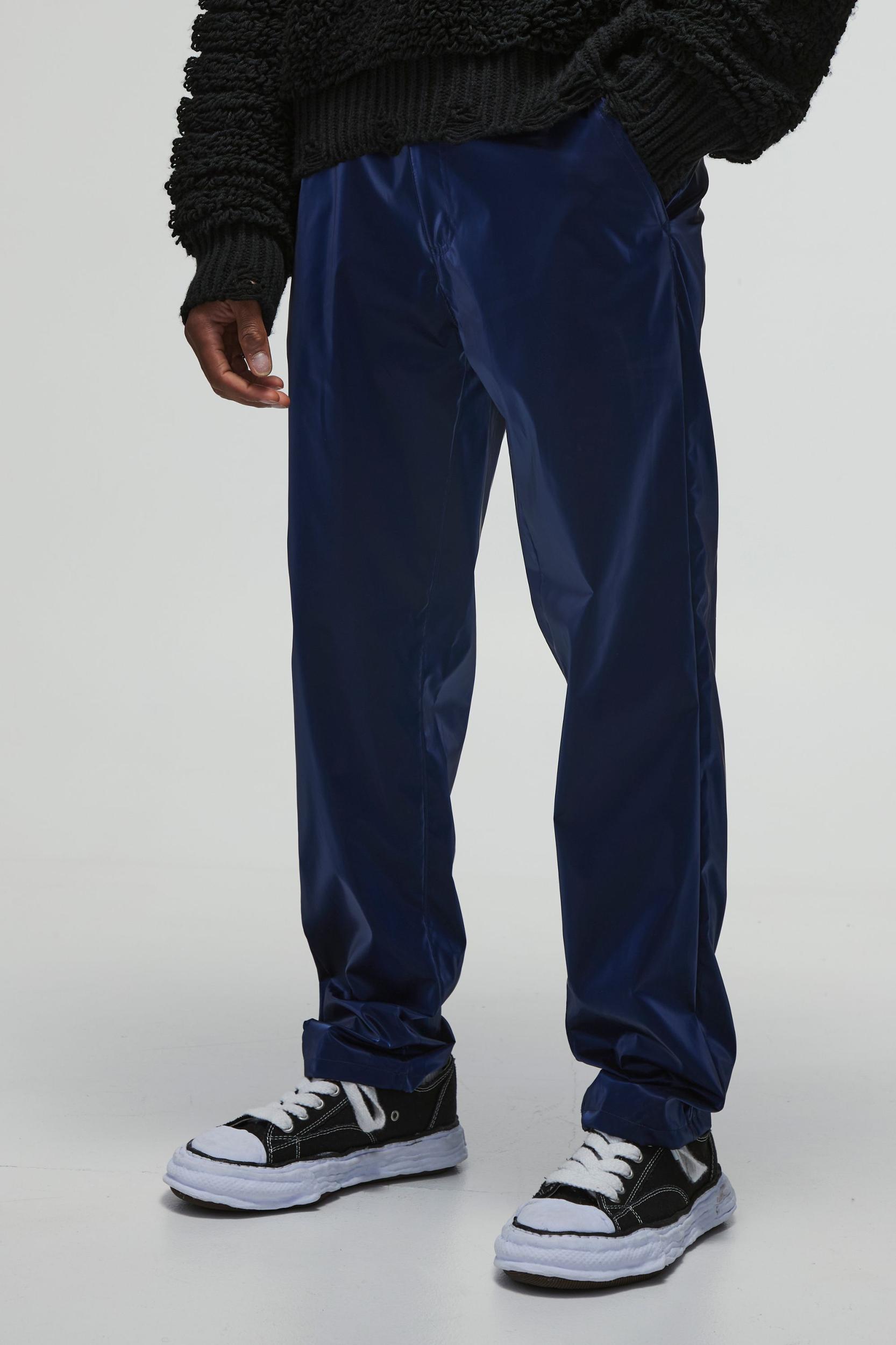 Mens Navy Straight Fit Liquid Nylon Trousers - Wanna keep things casual? These trousers are your new BFFs. Dressy casual, cocktail chic, beach formal - what do all those dress codes mean anyway? When youre not sure, you cant go wrong with a pair of mens casual trousers. Somewhere in between suit pants and jeans, casual trousers made from cotton, linen or parachute materials can be dressed up or down with shirts, polos or tees to fit all but the most formal of occasions. Weve got all the neutral browns, blacks, creams and blues, so slide a few into your wardrobe with some fresh trainers or slip ons and have a ready-to-go summer fit whenever you need it. Style: Plain TrousersDesign: Fabric InterestLength: Regular