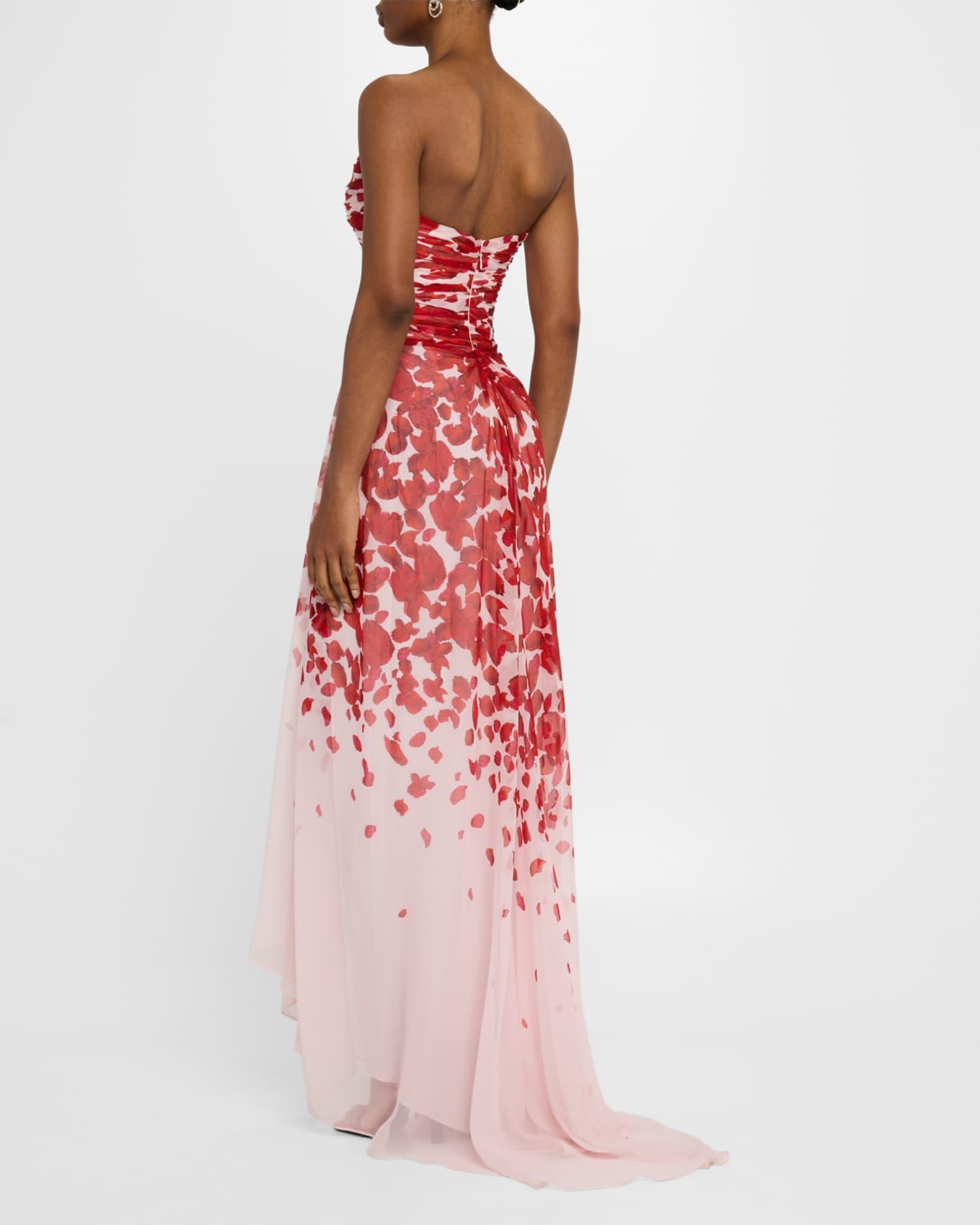 Monique Lhuillier draped chiffon gown fetauring a degrade petal print and a draped side slit hem Approx. 65"L from shoulder to hem Strapless sweetheart neckline Sleeveless A-line silhouette Floor sweeping hem with a train Back zip Silk Made in USA