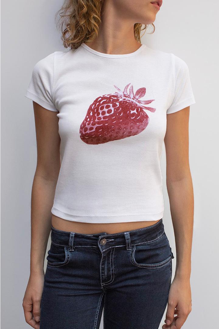 T-shirt with strawberry print, crew neck, short sleeves, regular length, relaxed fit.