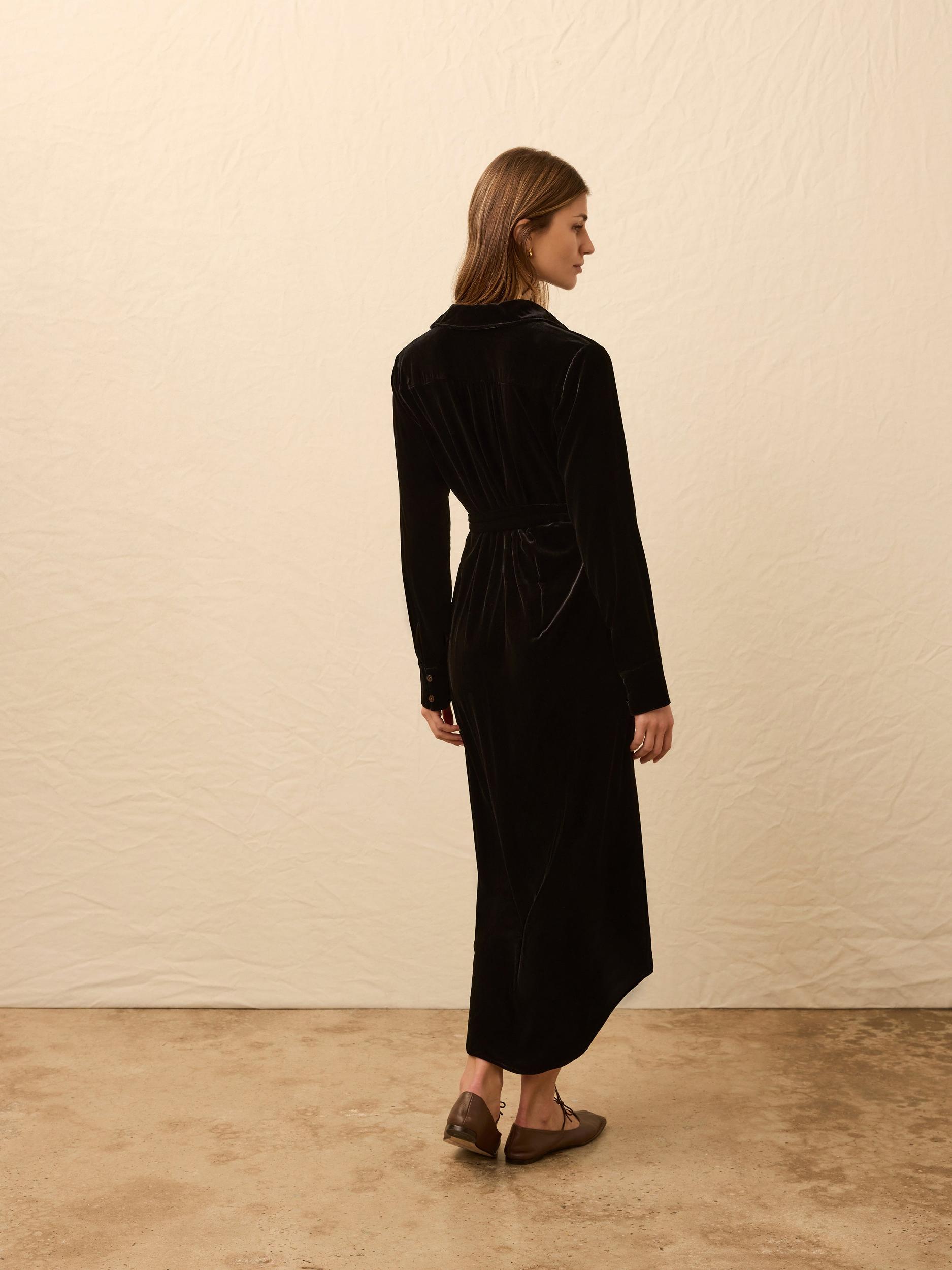 Our silk-kissed fabric adds extra luxury and subtle shimmer to this elegant but no-fuss velvet dress tied with a simple sash. An opened, gathered neckline gives it a lovely drape while gently gathered sleeves complete the charming look. Fit: Classic relaxed fit. Length: 53". Detail: Stretch silk velvet with shell buttons and shirring detailing. Material: 78% Viscose, 19% Silk, 3% Elastane; Shell Button Model: Thais is 5'10.5 wearing size Small Care: Dry clean. Do not bleach. WDH2418-BLK