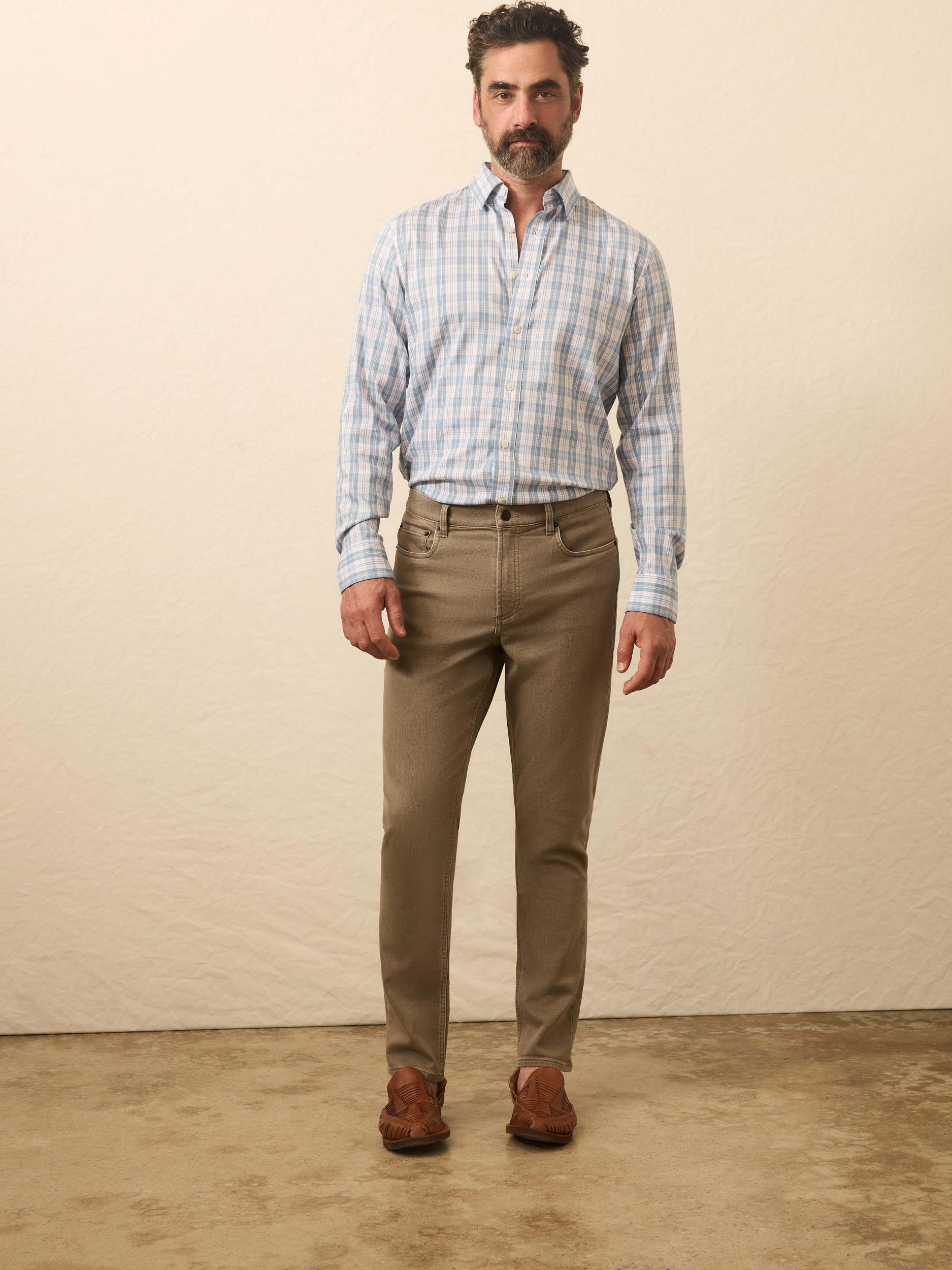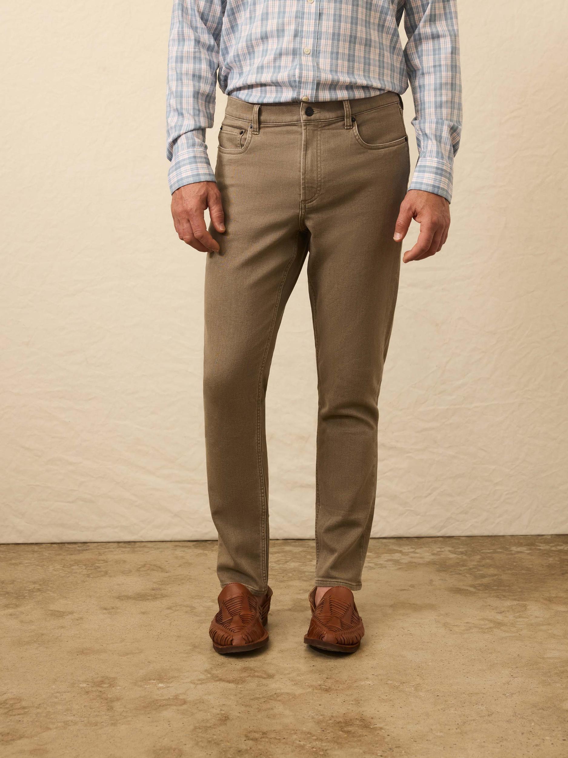 There's nothing quite like our Stretch Terry pants out there. Why? Frankly, there just aren't that many other people thinking about what would happen if they combined their favorite pair of jeans with absurdly soft sweatpants. The proprietary stretch fabric dreamed up by Mike, our Co-founder and Chief Creative Officer, makes it all that and more. This is our relaxed, straight leg style with more room in the thigh and seat than our original version for extra comfort. We recommend ordering your true size. Like new denim, they might feel a bit snug right out of the box but trust the process. Your natural movements will make them relax and conform to your unique shape. Also available in a Classic Fit in select colors Fit: A relaxed, straight leg. Sits just below the natural waist. These bestselling pants have a secret weapon – a proprietary stretch fabric dreamed up by Mike, our Co-founder and Chief Creative Officer. We recommend ordering your true size. Like new denim, they might feel a bit snug right out of the box but trust the process. Your natural movements will make them relax and conform to your unique shape. Detail: Belt loops. Classic 5-pocket styling. Metal Rivets for pocket reinforcements. Metal fly zipper. Faherty logo back patch at wearer's right. Material: 83% Cotton, 16% Polyester, 1% Elastane; Sun & Waves Shank at Center front Closure; Hand Pocket Rivets; Antique Silver Metal Center front Fly Zipper; Faux Leather Logo Patch Model: Jamal is 6’2 wearing size 32X32 Care: Close all zippers before wash. Turn inside out. Machine wash cold with like colors. Delicate cycle. Do not bleach. Tumble dry low. Remove promptly. Warm iron when needed. MBF2441-DFT