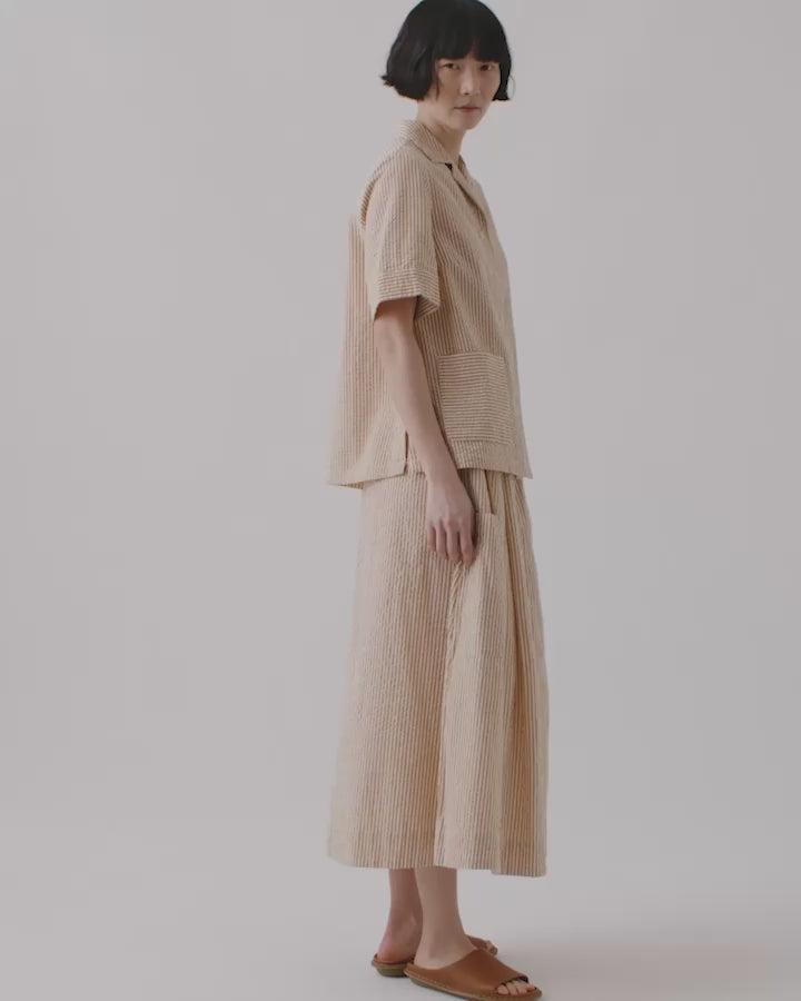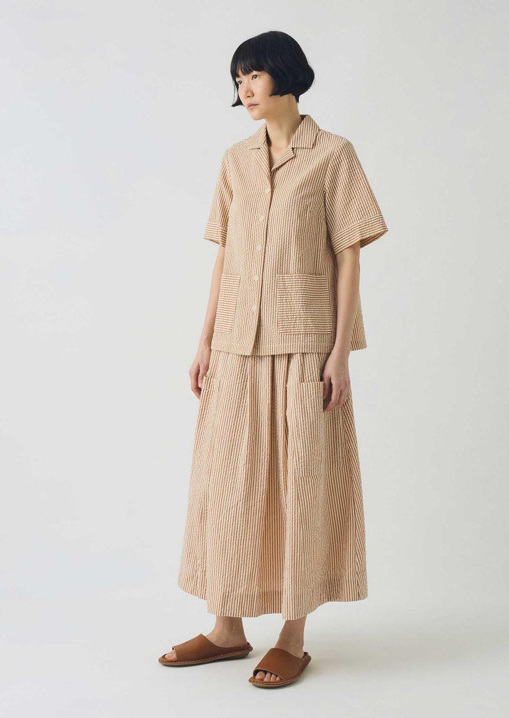 Our shirt is made from a textured cotton seersucker, woven with a gentle stripe. Cut to an easy fit with a camp collar, and featuring patch pockets either side of the placket. Secured with corozo buttons.