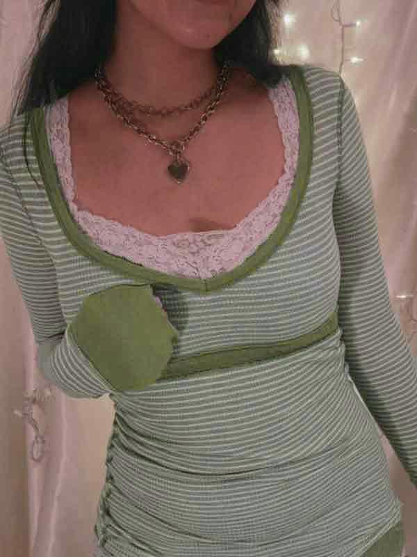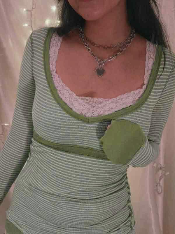 Stripe Patchwork U Neck Slim Long Sleeve Knit
