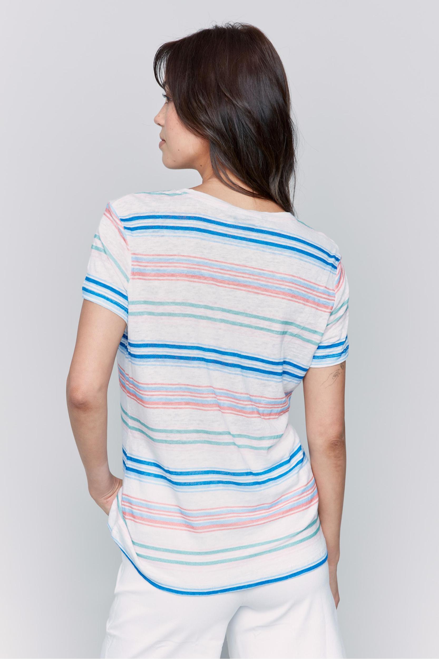 Refresh your spring wardrobe with our linen blend striped V-neck T-shirt in a lilypad shade that enhances your fashion flair. Featuring a graceful v-neckline and multicolored stripes, both versatile and fashionable, it's an indispensable choice for those looking to effortlessly elevate their style game.